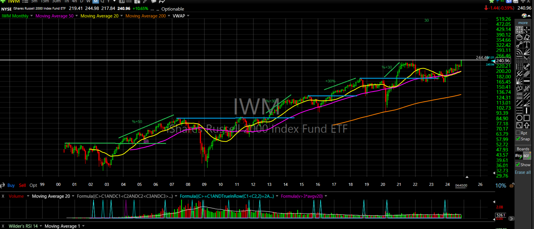גרף חודשי משנת 2003--2002 מה קרה כל פעם שנפרץ שיא כל הזמנים חדש 4 פעמים המדד עלה מעל 30% אחרי שפרץ שיא כל זמנים. השאלה מה יקרה במידה ויפרוץ את 244 יעלה גם 30% נראה בוא לא נהייה חזירים אבל אם המדד יצליח לפרוץ244 וישמור על 240--244 בהחלט יכול לעלות 15 % שזה 50% ממה שהוא עולה בדרך כלל. לא יודע אם זה ייקרה או לא סתם משהו שמשך את תשומת ליבי