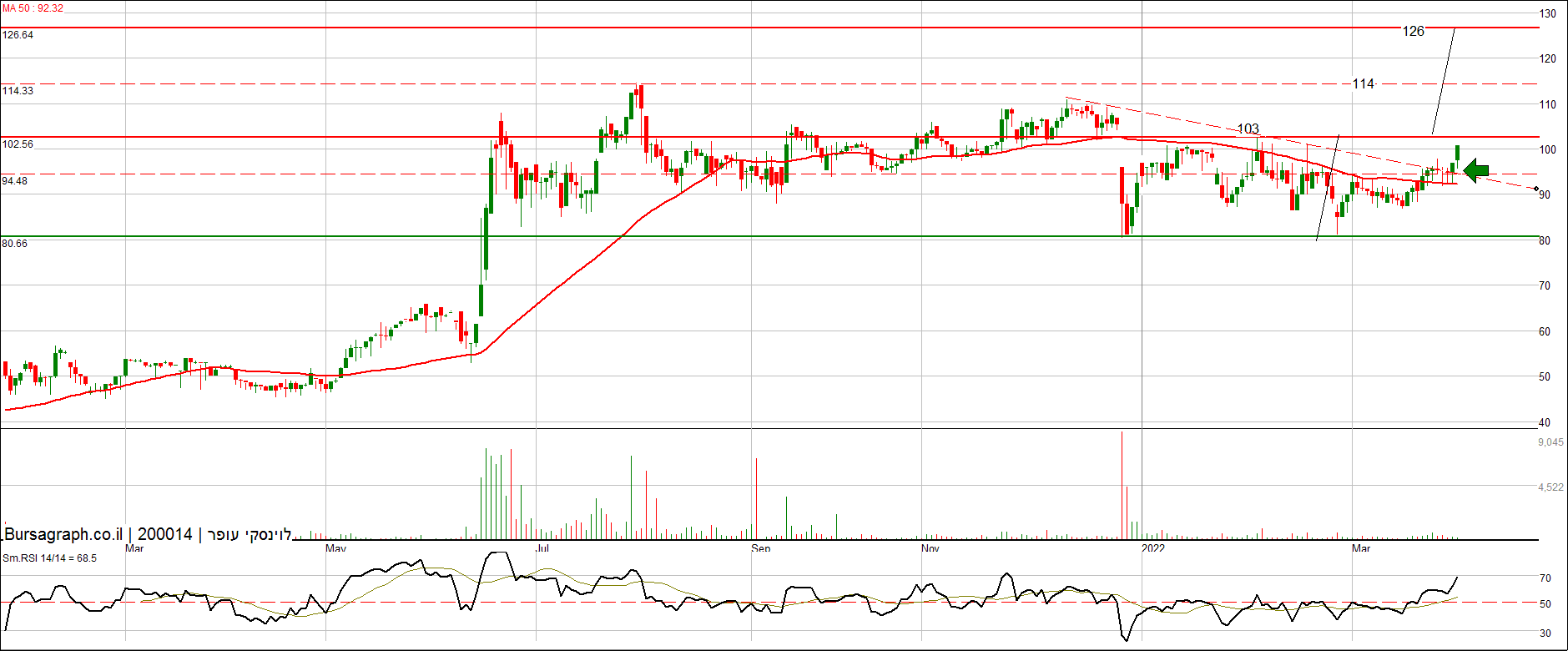 אחרי שהצליחה להתמקם מעל ממוצע 50 לראשונה מזה זמן רב, מגיע לרצועת מחיר שקצת בולמת אותה. פריצה מעל 102-103, תמיכה קרובה ממוצע 50 ב93