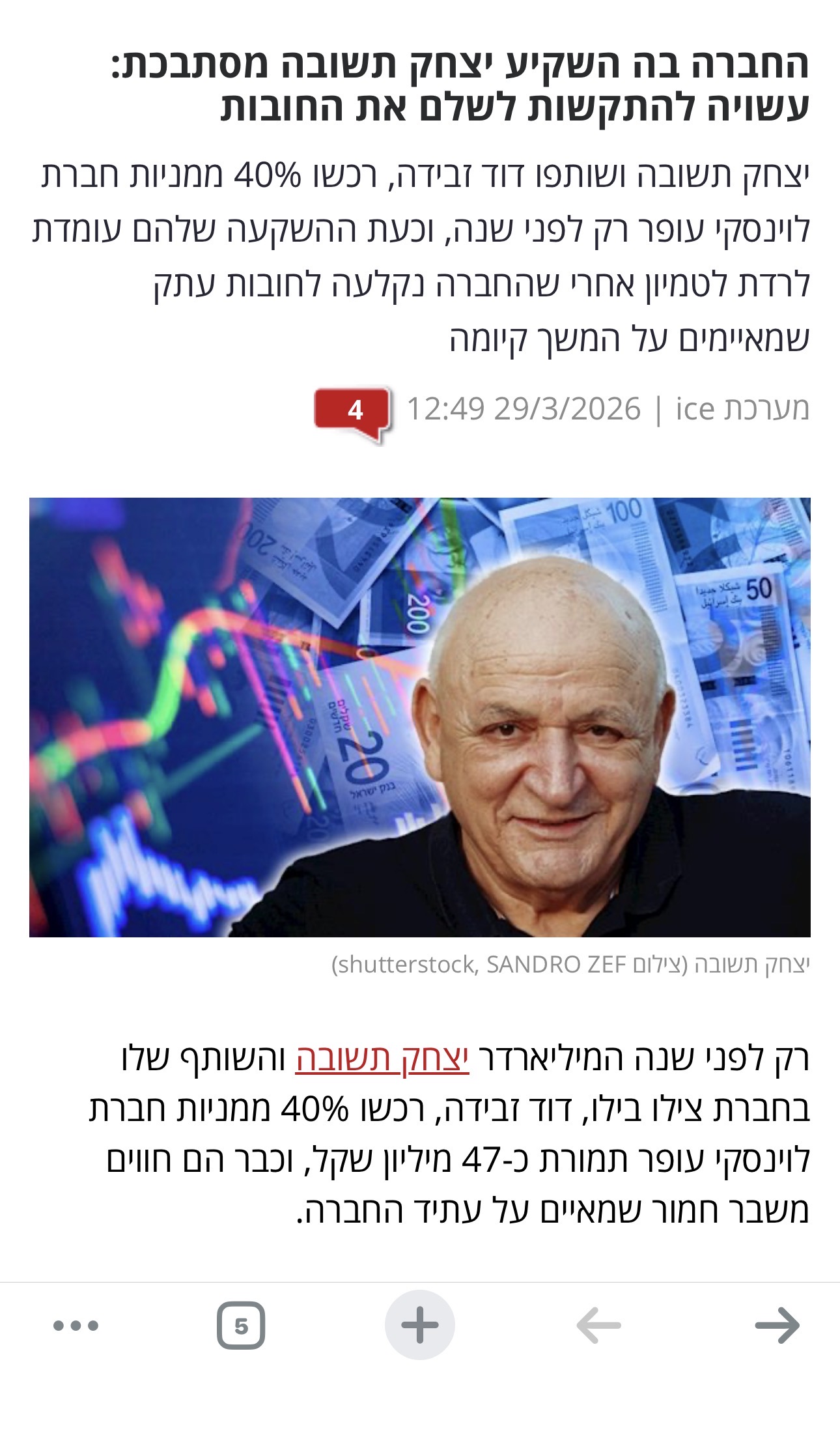 בדרך לפשיטת רגל יצחק תשובה ושותפו דוד זבידה, רכשו 40% ממניות חברת לוינסקי עופר נדל"ן רק לפני שנה, וכעת ההשקעה שלהם עומדת לרדת לטמיון אחרי שהחברה נקלעה לחובות עתק שמאיימים על המשך קיומה