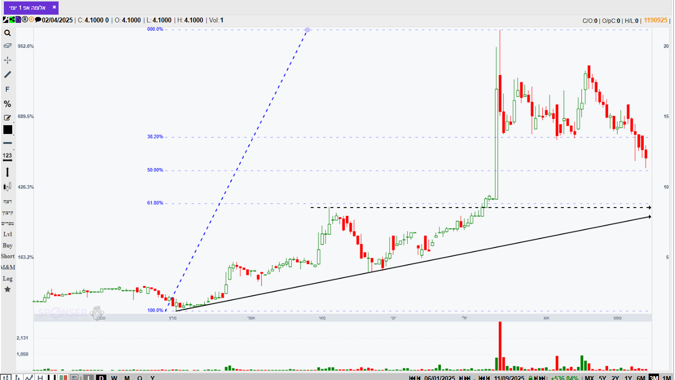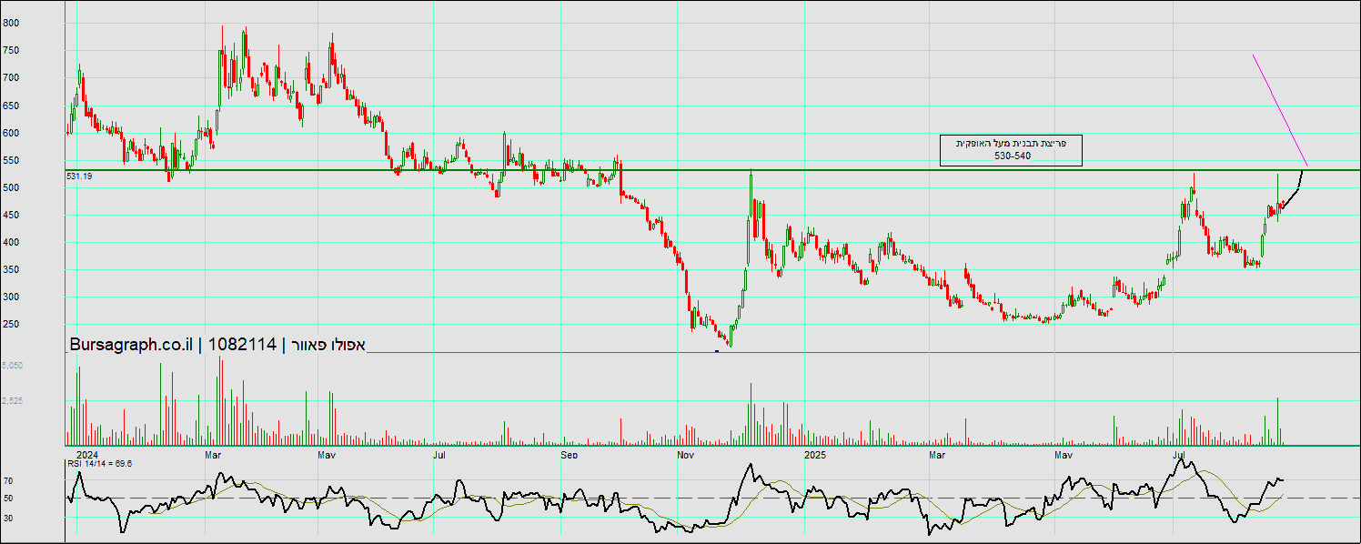 כרגע מגמת העלייה נעצרה וכל עלייה מביאה מיד מוכרים, נתמכת באזור 9400, בחודשי כל הנרות האחרונים מחוץ לבולינגר ומגמת עלייה חזקה מאוד. אינני יודע אם מתאווררת להמשך עליות או שהיא לפני תיקון. מההחזקות הגדולות שלי בתיק.