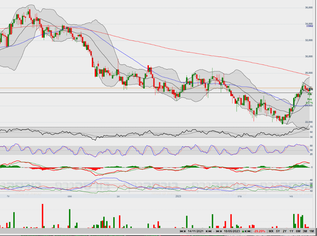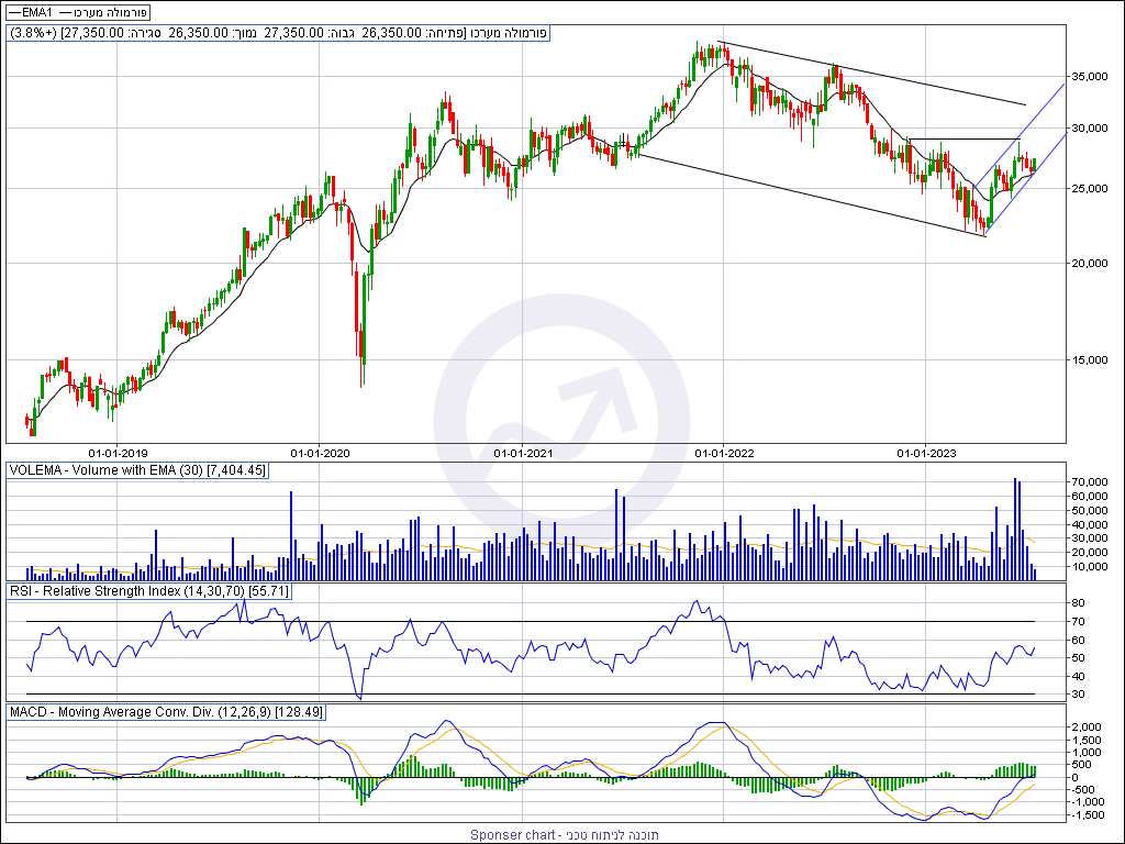 המניה התהפכה בשבועי על תחתית תעלה עולה,ואם תמשיך עם המומנטום החיובי אזי היעד הבא-29100.