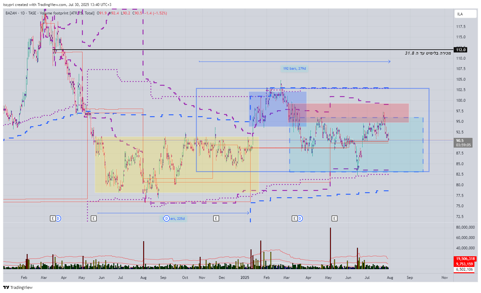 התמונה אולי מורכבת בגרף שלי אבל בפשטות - המחיר מתנהל במבנה כבר כ 280 יום (מלבן כחול) שהכיוון הכללי בסופו של דבר הוא אזור 112. זה אומר שלדעתי כל התנועה הזאת זה איסוף מחדש. הרצועה האדומה היא רצועת מוכרים פנימית שאני מניח שתיפרץ בהמשך. מחזיק.