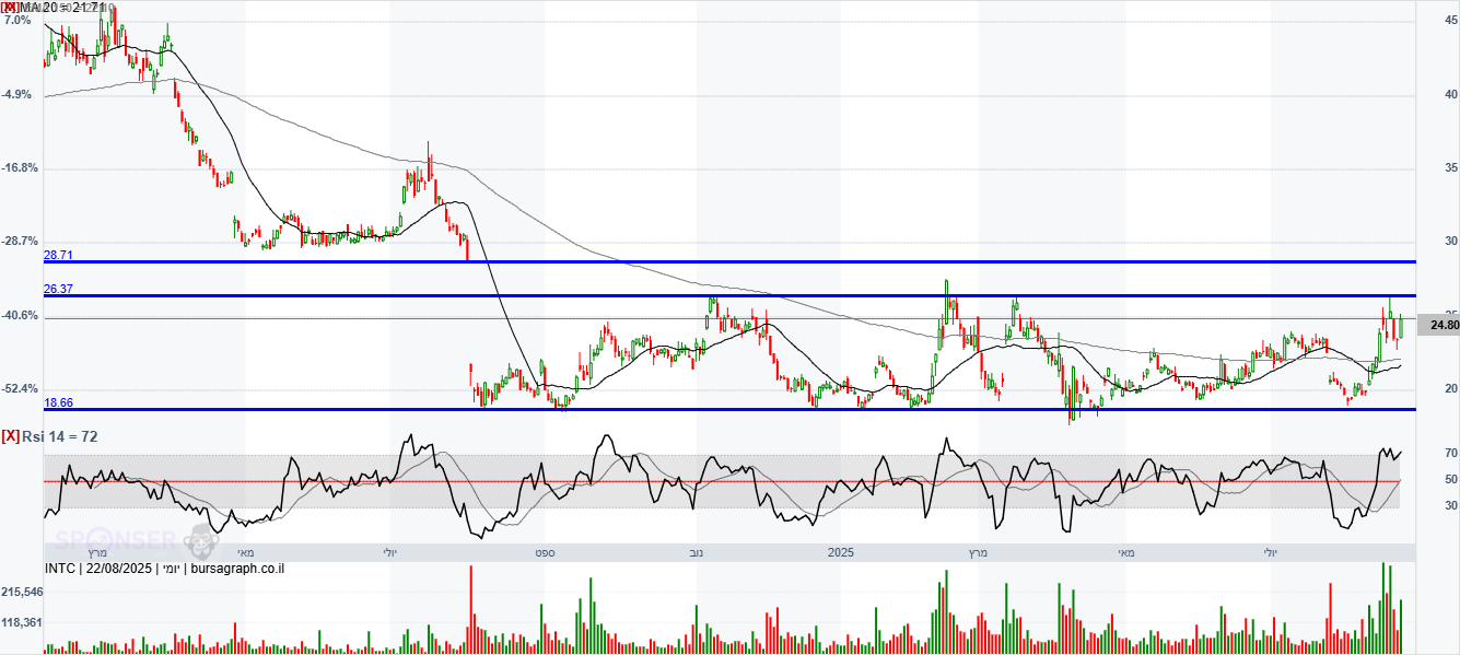 על אינטל.האם כדאי ליקנות/להחזיק? כאחד שמשחק איתה בשנה האחרונה קצת. באופציות. יכול להגיד שהמניה ניראית בנקודה מעניינת. עושה רושם שהמנכל החדש הוא האיש הנכון במקום הנכון. לדעתי עד סוף השנה ניראה אם הרע מאחרינו. בהחלט לא פוסל את זה. ג.נ מחזיק קצת קולים ל26 ושוקל אם להגדיל. הגרף שלה מעניין לדעתי. שימו לב לגאפ הפתוח ב28.7