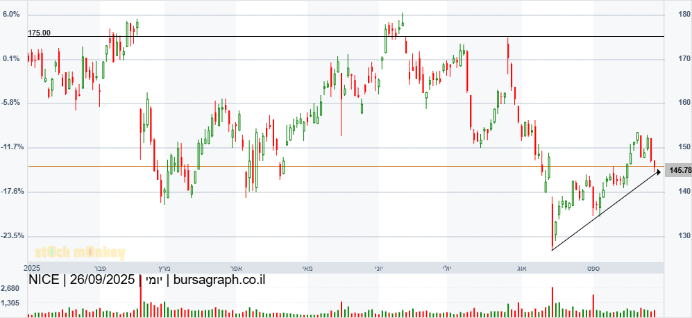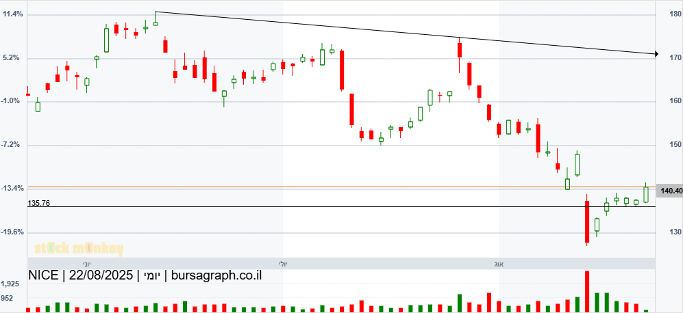 נייס נעה מפברואר עד יולי בין 137 ל180 והייתה הרבה זמן מעל 155 כשכל יוני לא ירדה מ158. היא שברה רק באוגוסט עד 127 ואתה צודק שיש תמיכה חזקה מתחת 140-141 וזה 137-138, ומתחת 127. אני עדיין חושב ששבירה של התמיכה ב141 תהיה לא טובה, ומעל 155 הדרך למעלה תהיה פתוחה עד 170. מסכים שהעתיד לגביה לא ידוע.