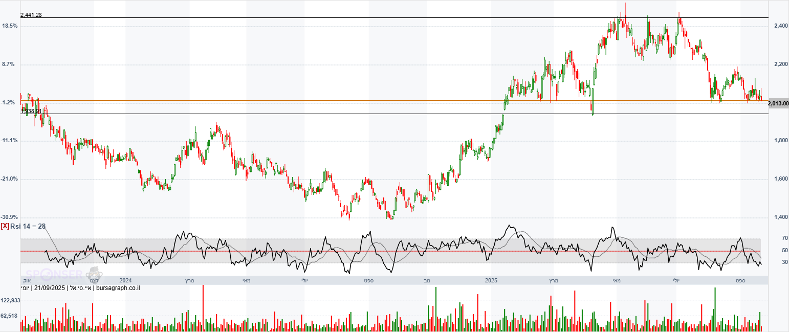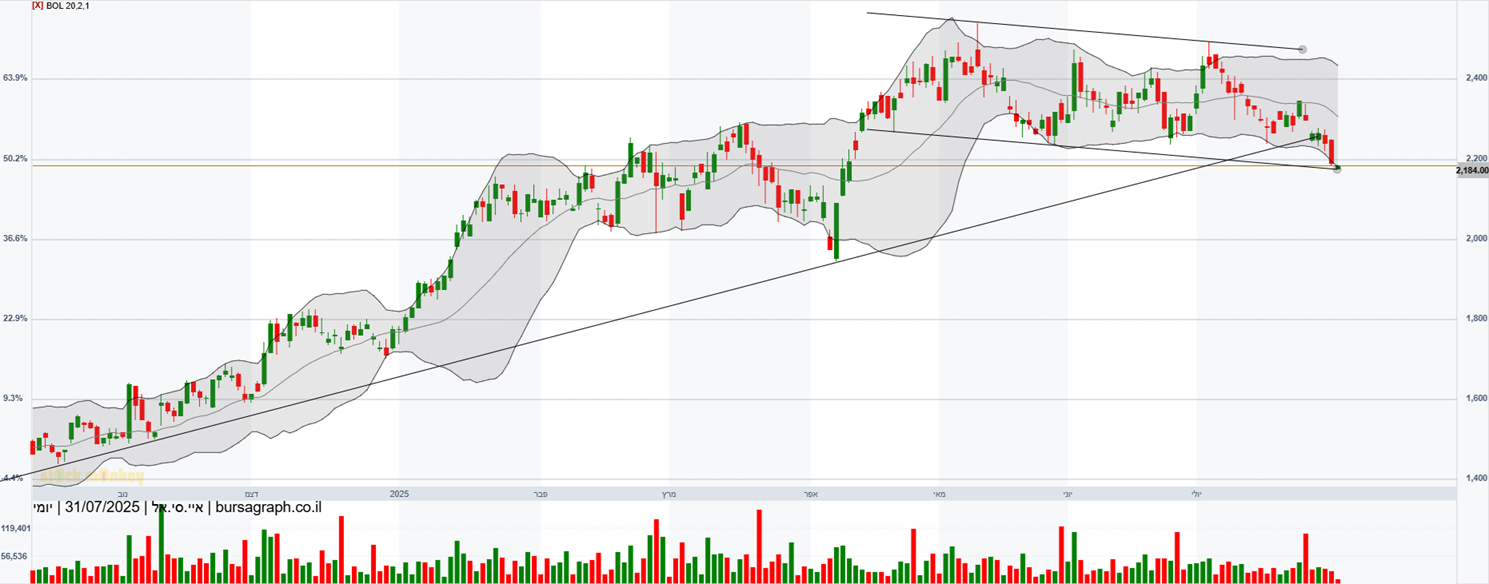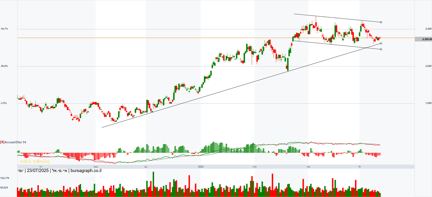 חלשה לאחרונה, שברה קו מגמה עולה ארוך טווח וכרגע על תחתית תעלה יורדת. היפוך פה יכול להיות מעולה ובשלב ראשון להביא אותה ל2300 שבירת התעלה תיקח אותה ל 2106 מחזיק ולא ממליץ