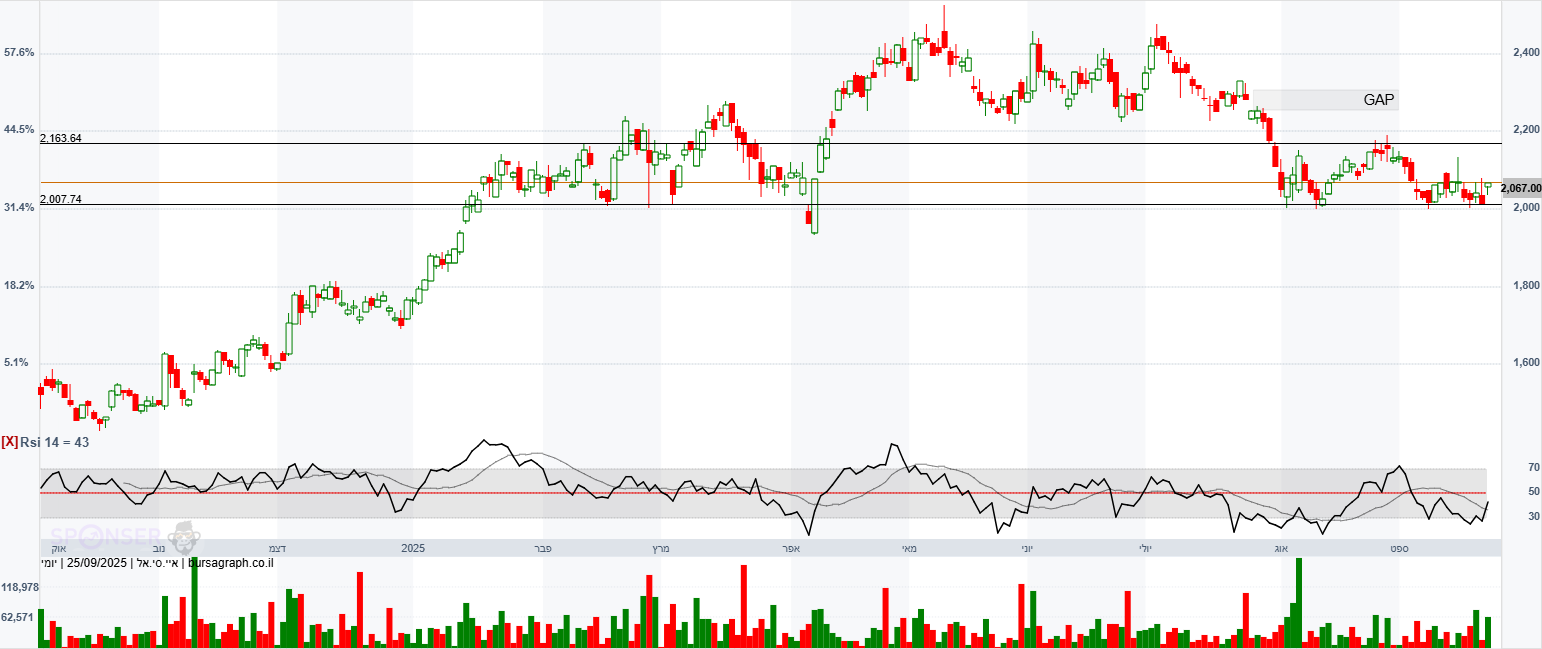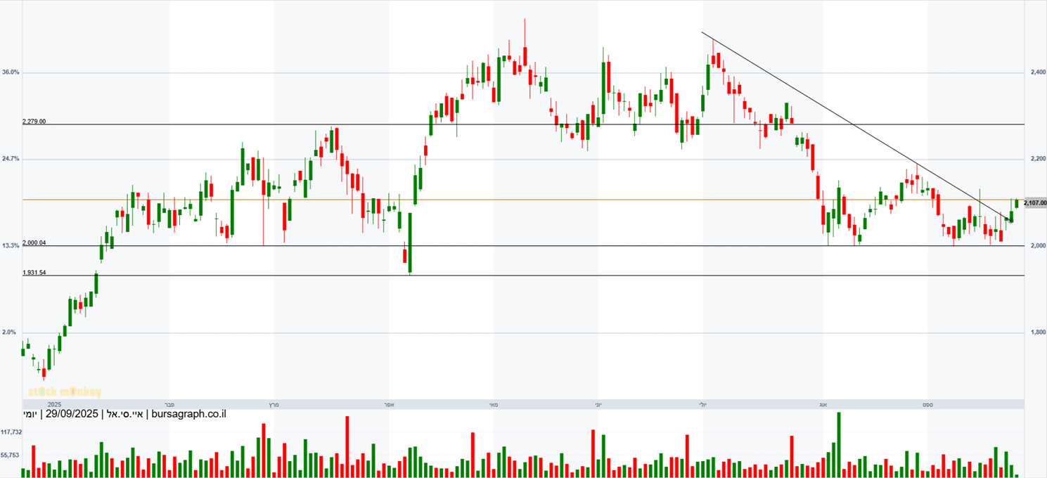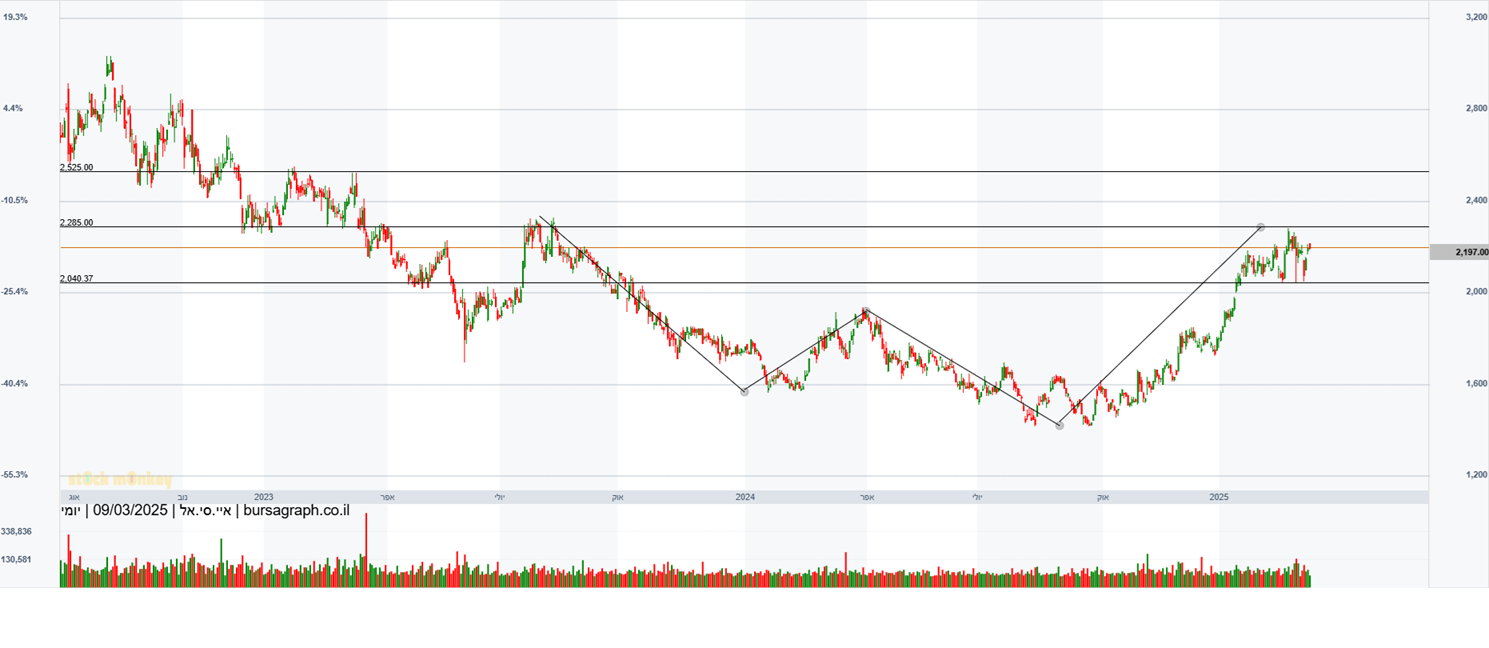מגמה כללית שלילית. הגיעה לתקרת תעלה יורדת. פריצה והתבססות מעל קו המגמה היורד, תוביל בשלב ראשון לבדיקת גבוה אחרון באזור 2279. כישלון בפריצה יכול לקחת אותה לתחתית תעלה באזור 1900 לא מחזיק ולא ממליץ