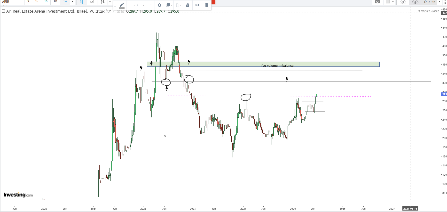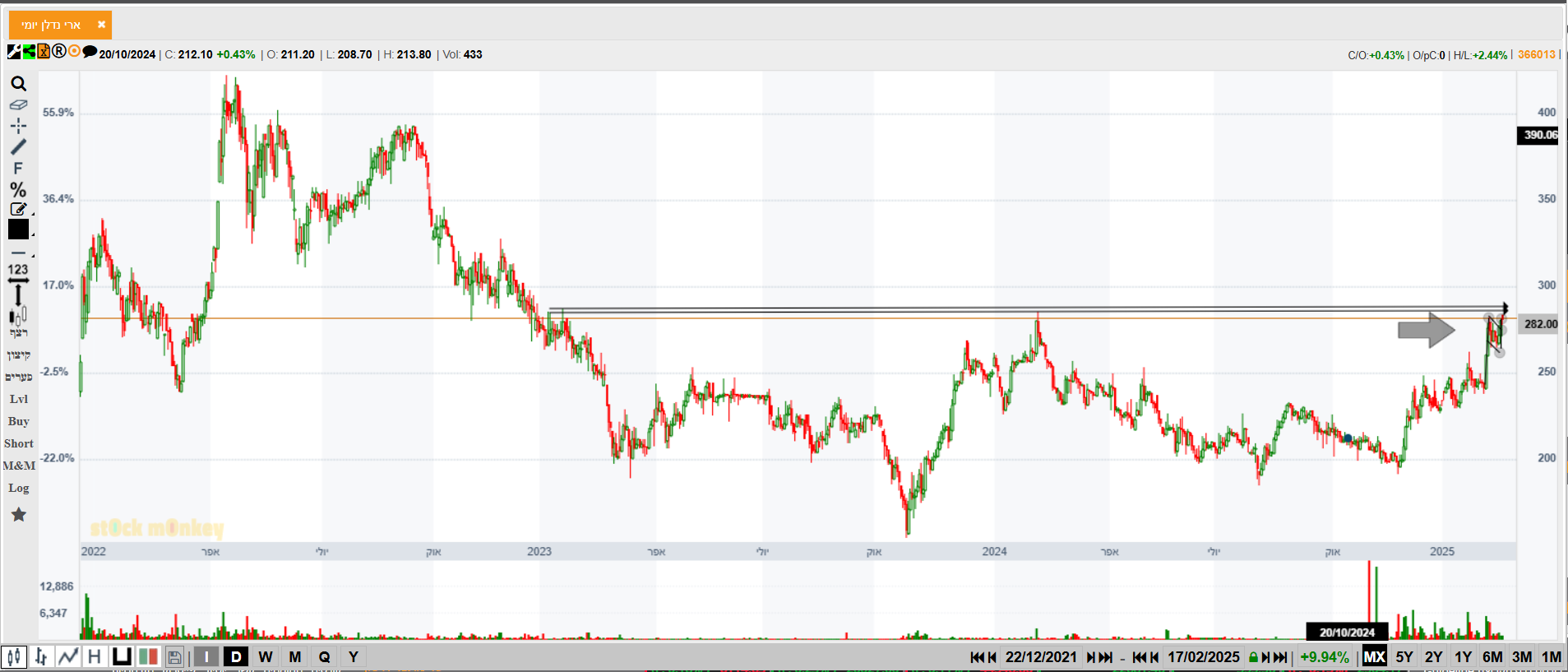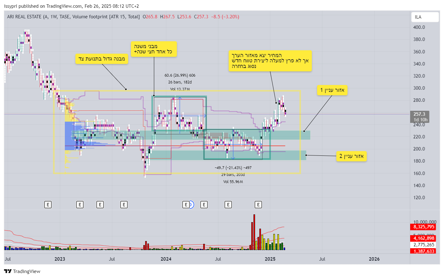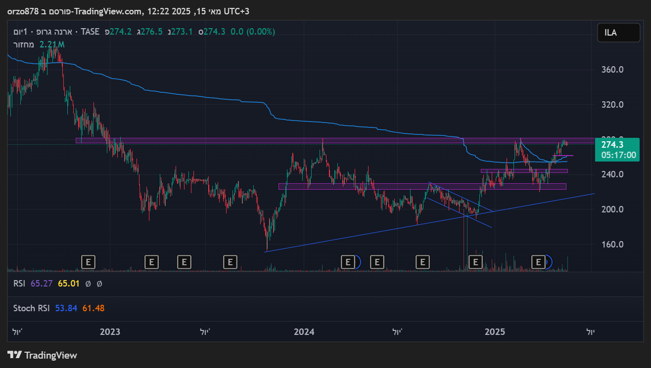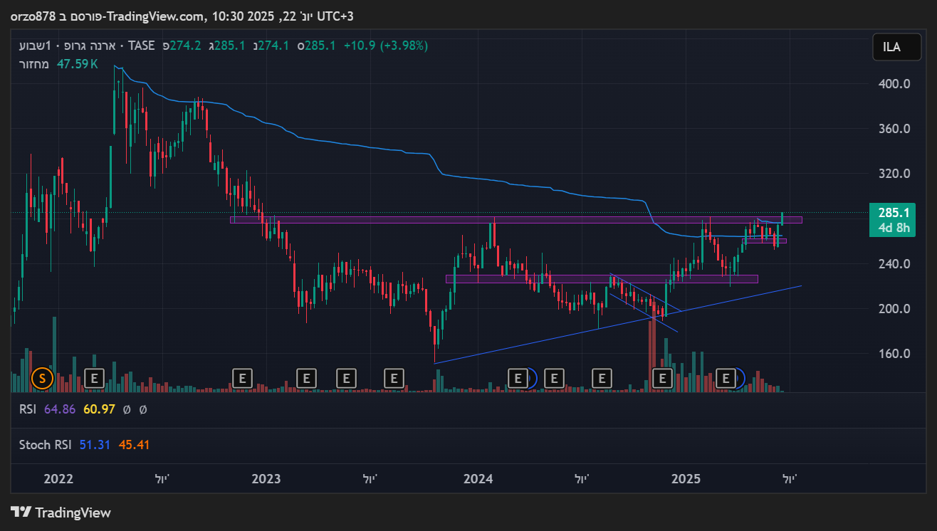 המניה עכשיו במחיר של 2022, ורחוקה עשרות אחוזים מהשיא שלה שם (להבדיל מהרבה אחרות בתחום). השיא שלה בהמשך 2022 הוא 400. בהתחשב במה שעבר מאז 2022 על מחירי הנדלן והמדד, פתאום 400+ נשמע הגיוני יותר.