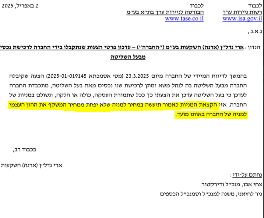 אבו מעדכן שההצעה במניות, לפי מחיר שלא יפחת מההון העצמי. הון עצמי למועד הדוח 943 מיליון שווי שוק ארי נדל״ן להיום בבוקר 798 מיליון פרמיה של 18%. מעולה לשני הצדדים בעיניי והבעת אמון יפה מאוד של הבעלים צחי אבו. אבל יש צורך לחדד - העסקה לא בהכרח תצא לפועל והעסקה לא בהכרח תהיה במניות, אך אם תצא לפועל ותהיה במניות הן יהיו במחיר המשקף את ההון העצמי (280-290). באופן אישי קשה לי להאמין שהחברה תעמיס עוד חוב, בטח בהתחשב בכמות הפרויקטים בייזום ובנטל הכלכלי שלהם, כך שלדעתי העסקה אם תהיה תהיה כולה/רובה המוחלט במניות.