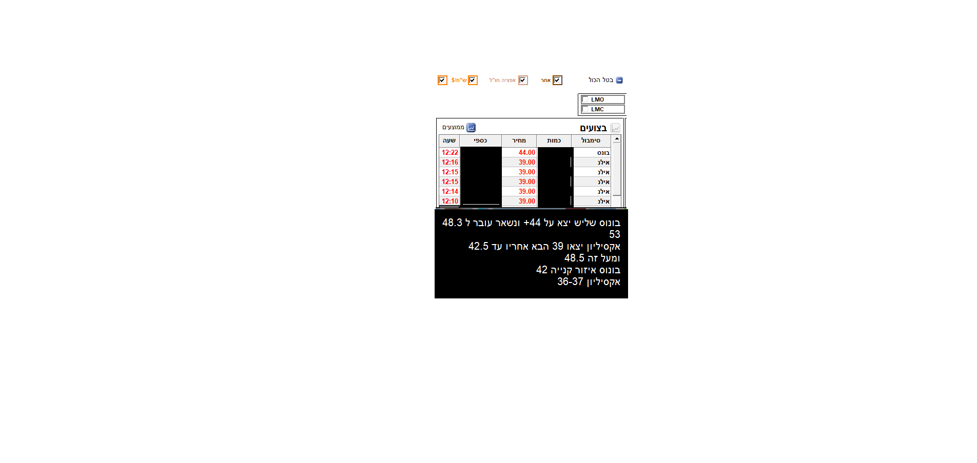 רמת התנגדות ראשונה של בונוס עומדת לדעתי על 42.0 - 44.0. יעד להמשך אם תפרוץ תעלה לכיוון 48.5, ולאחריו חזרה לבדיקת השיא השנתי באזור ה-60.9.