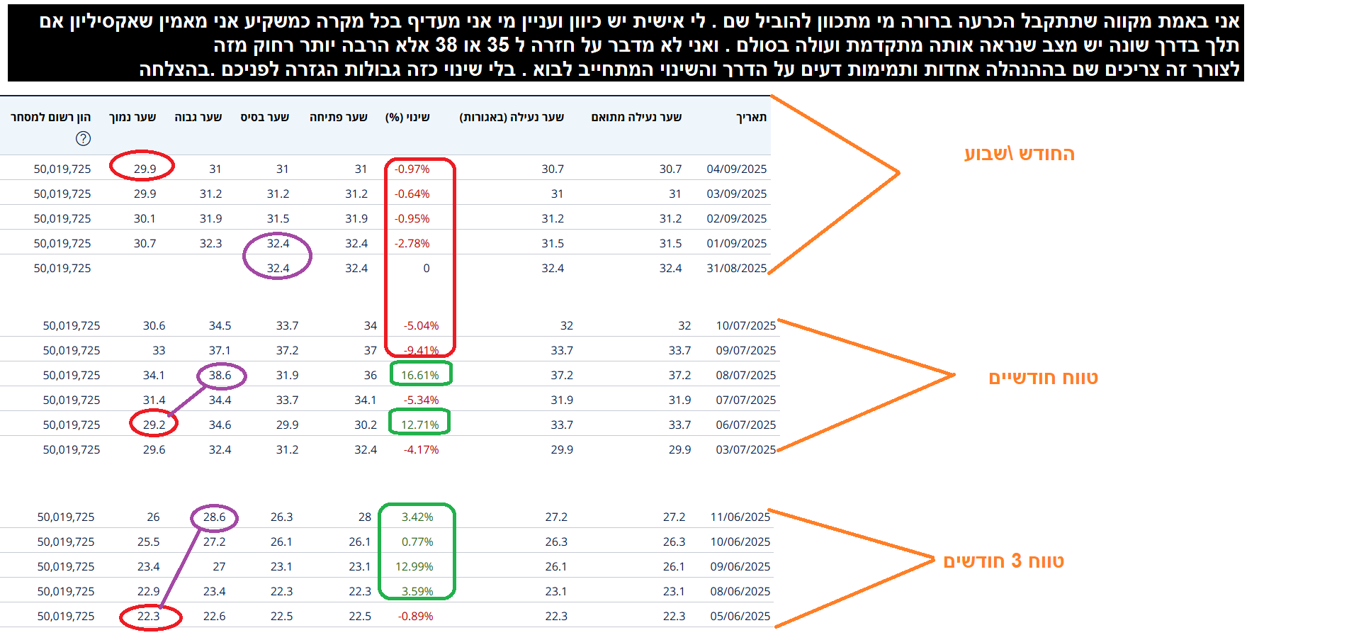 נקודת האיפוס וזה אחרי חודשים לא קלים בהן עלתה מ איזור ה 20 עד ל 33 ואני מעריך שהשינוי הגדול יגיע לאחר מעבר על נקודה חשובה מאד 35 (שער קניית הזכויות וצופר האופציות ) בינתיים לא מכרתי כלום אני ממוקם למכירה החלמ 35.5 ועד איזור 55 מקווה בשביל כולם שלשם היא הולכת. עדיין ממתין בסבלנות לניתור חד בין 25-35 %+ בהצלחה