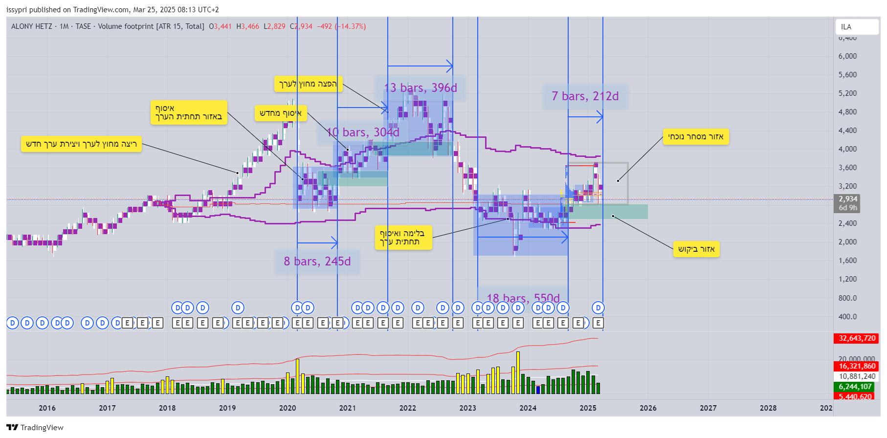 מיפוי של המניה מ 2018 ועד היום. ראשית, רואים אזור ערך ברור המתואר ע"י העקומה בסגול. הוא נוצר בראלי של 2019-2020. מעל יקר, בתחתית ומתחת לה - זול. המבנים מסודרים. מ 2020 רואים מבנים מסודרים שעולים בתוך הערך. כל מבנה כזה ערך בין 9 חודשים לשנה +. שהמחיר הגיע מעל החלק העליון של אזור הערך, הוא הפיץ רואים ב 2022 שהמבנה פחות צפוף (היבועים הסגולים שמראים את מרבית הווליום בכל נר, רחוקים אחד מהשני) ויותר גבוה. זה אומר שכל תנועה אגרסיבית, עשתה מרחק גדול יותר. זה אומר חוסר נזילות ומרמז יחד עם היציאה מהערך, על הפצה. המחיר גלש מהר לתחתי הערך שם נבלם אסף והתחיל עליה. האיסוף היה ארוך, כמעט שנתיים. מה שקורה כעת הוא כנראה איסוף מחדש. אזור הביקוש הנוכחי מהאיסוף למבנה הנוכחי נמצא ב 2500-2830. הצפי הוא ל 4000-4400. אנחנו כבר מעל 200 יום במבנה הנוכחי.