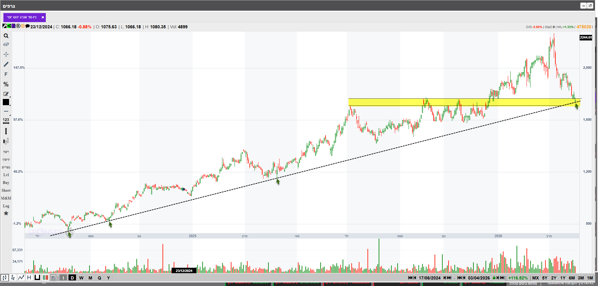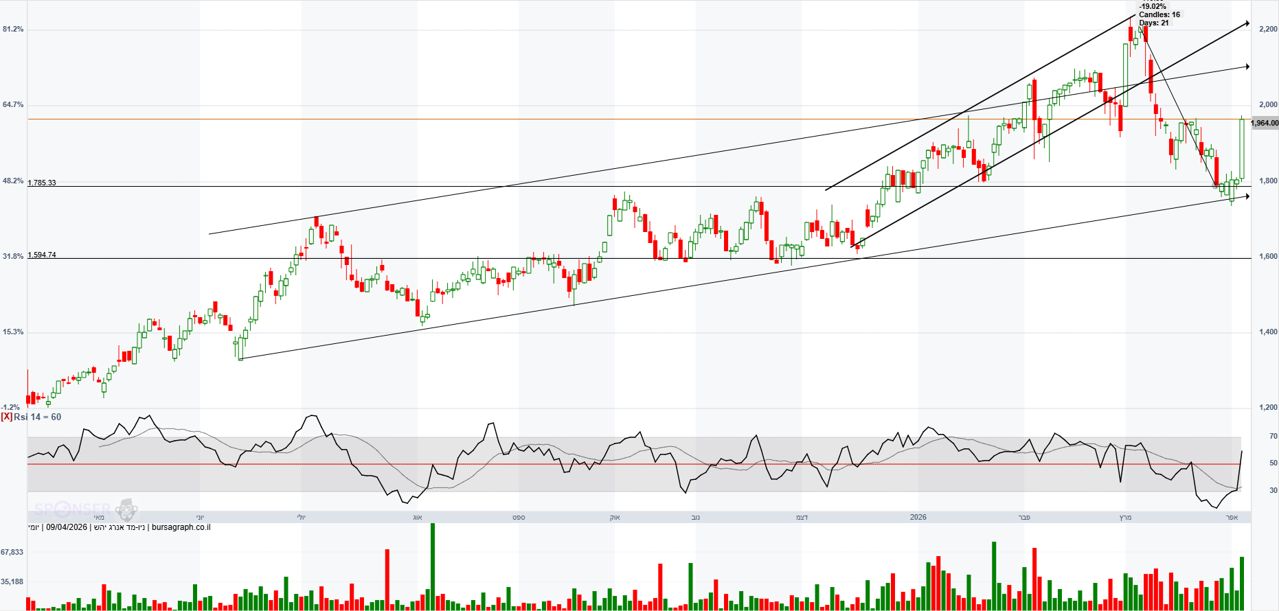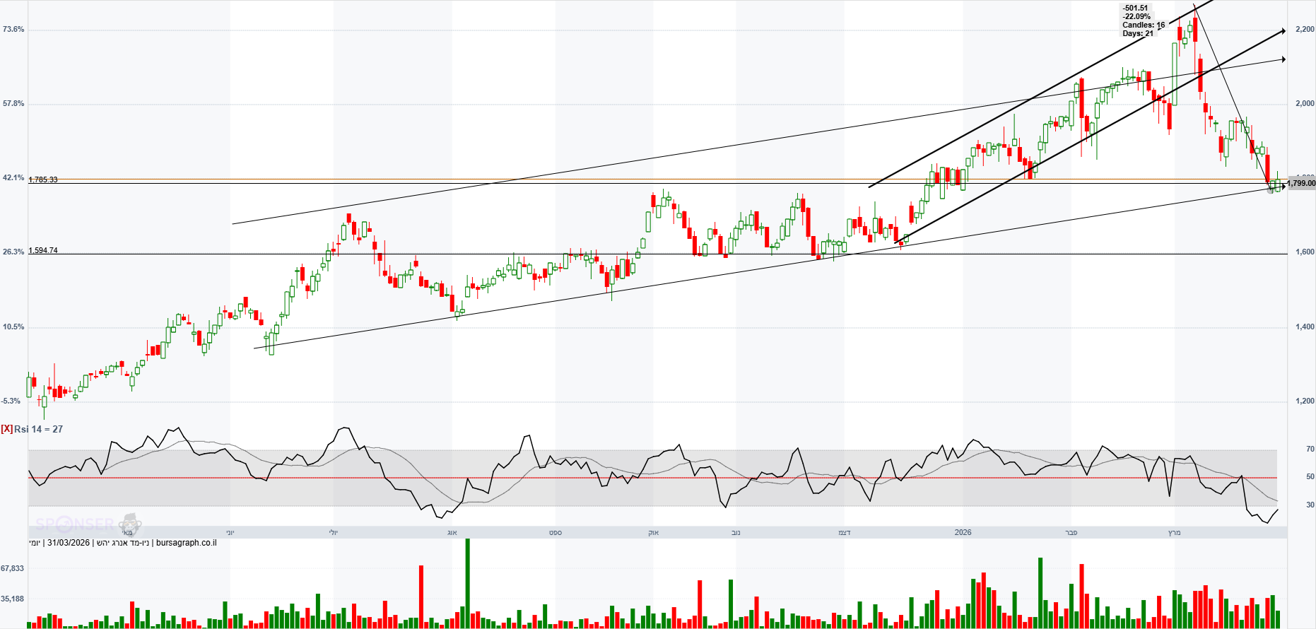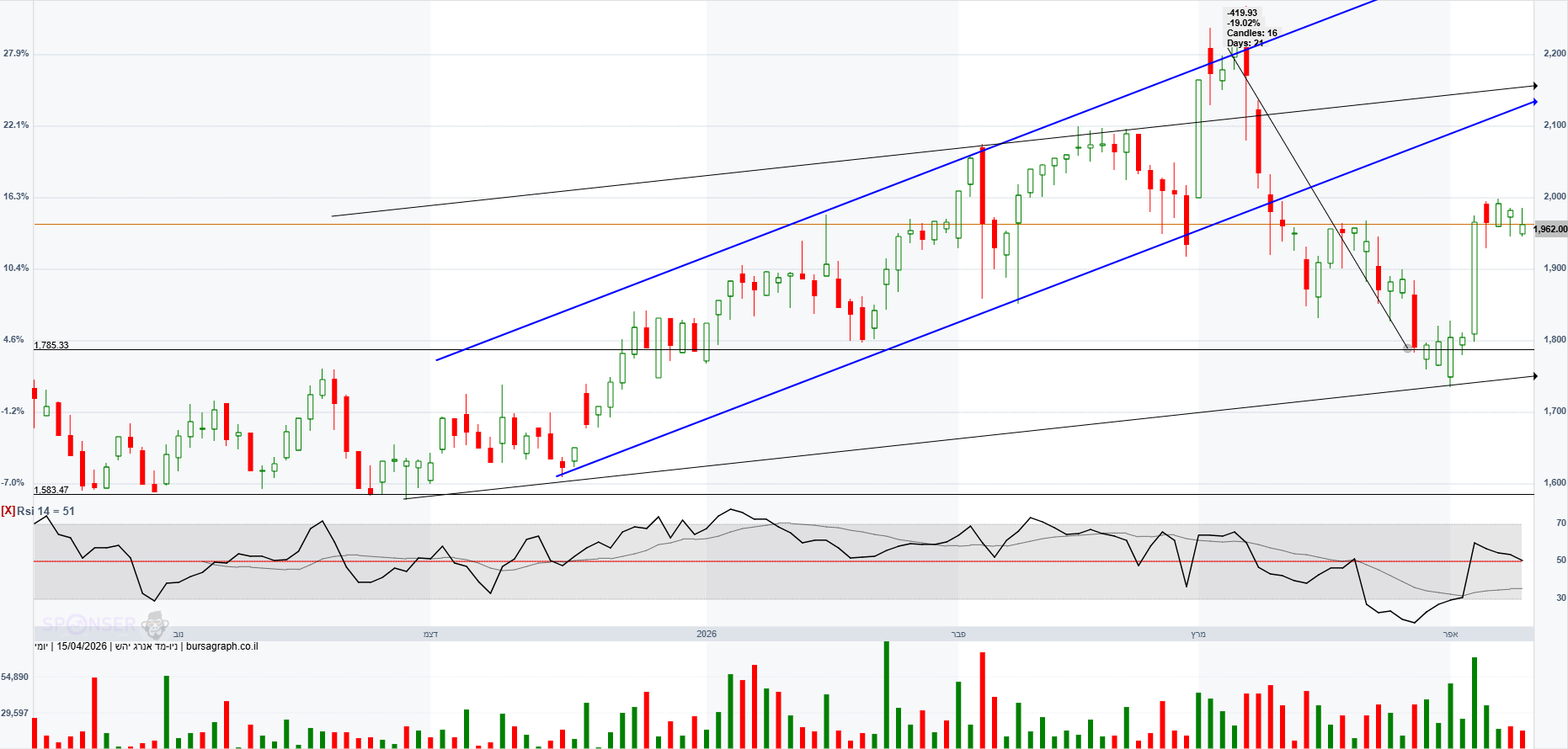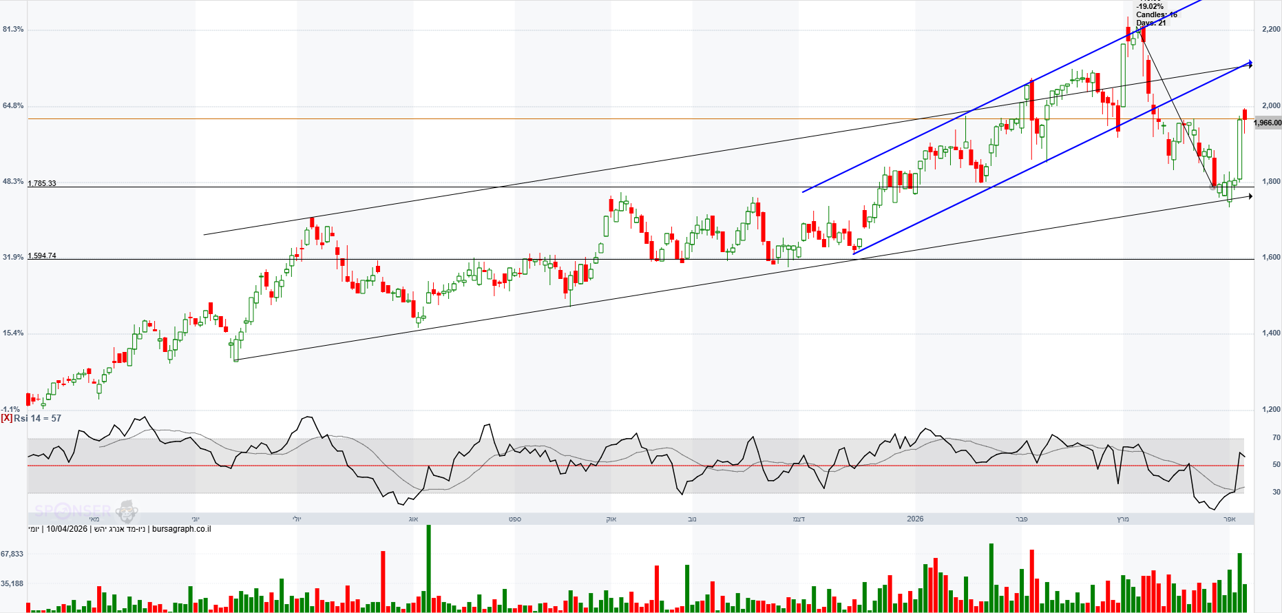 הגרף כרגע מתרחק מתעלה עולה פנימית. המניה לא התרגשה מהסכם קידוח אפרודיטה שאולי יביא הכנסות בעוד כמה שנים.המניה לא הגיבה בעלייה. קידוחי בולגריה יצאו יבשים וירשם הפסד בגינם ברבעון ראשון של 2026. במשך 33 ימים במהלך המלחמה אסדת לוויתן הושבתה מה שהביא להפסד הכנסות. באפריל 2026 הודיעו על עליית גז הבישול לצרכן מה שאמור להביא להגדלת הכנסות. בשוק הבינלאומי הצפי הוא כי במהלך 2026 יחול גידול בהיצע הגז הנוזלי מה שיביא לירידת מחירים.ב דצמבר 2025 ניתנו אישורים סופיים לעסקת היצוא הגדולה בתולדות המדינה על סך 35 מיליארד ש"ח מול מצריים. בינתיים המניה לא חוזרת לשיאים בהם הייתה מעל 2,000.אולי רק החלטה סופית על הרחבת מאגר לוויתן הגדלת כושר ההפקה מ-12 BCM ל-21 BCM בשנה תגרום לה לחזור לשיאים.