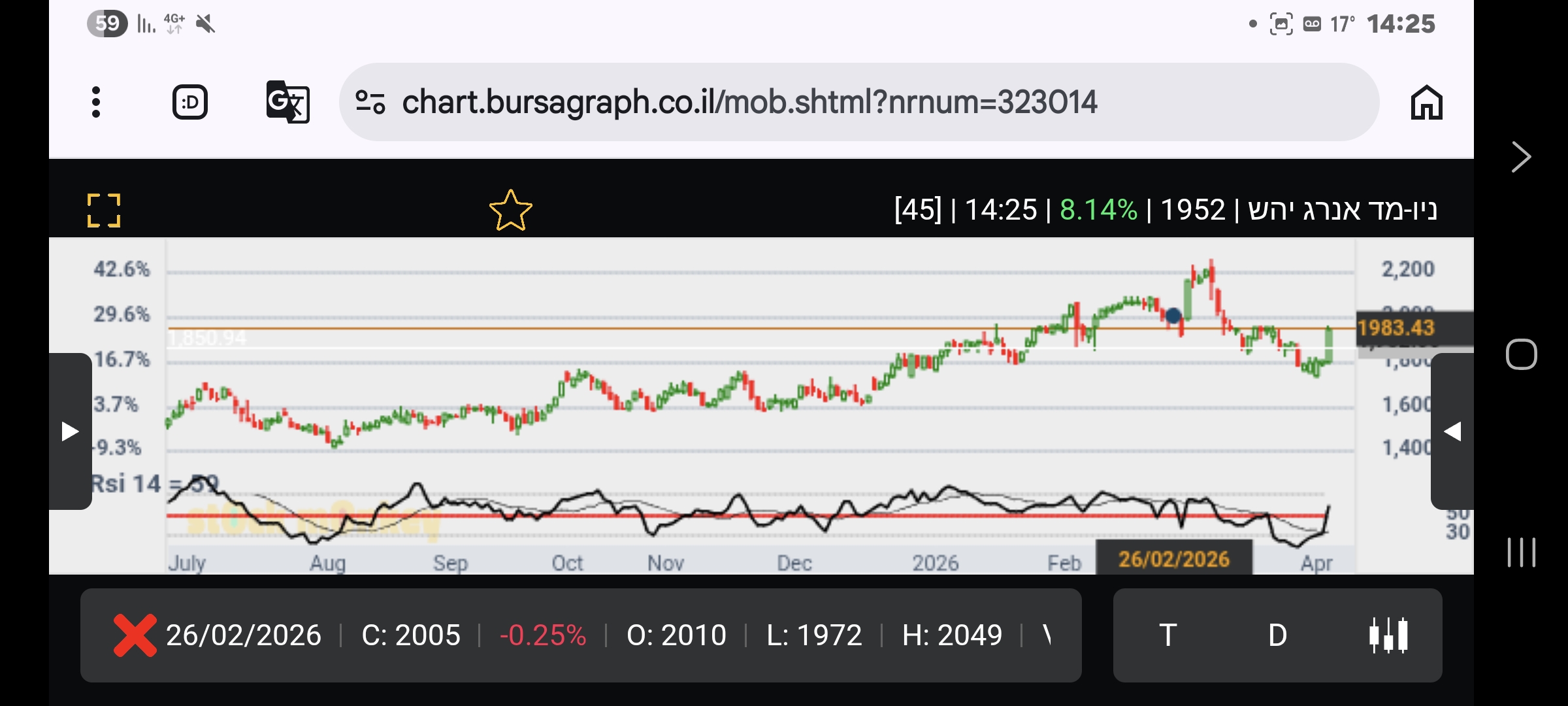 סוגרת בשער 1966 נר אדום למרות העליה כי פותחת בגאפ כלפי מעלה אך יורדת במשך היום.בתקופה של שלושה שבועות ירדה 19% כנראה בגלל קידוחים יבשים בבולגריה שגרמו להפסד והשבתת ההפקה מהמאגר במרבית ימי המלחמה.עם החזרה להפעלת האסדה והידיעה על עסקת מכירה עתידית(2031) מאפרודיטה נראה שתחזור לשיא שלה בזמן יחסית קצר ותעבור שוב לתעלה העולה התלולה יותר.נראה מה השוק יחשוב על עסקה שתממש בעוד 4-5 שנים