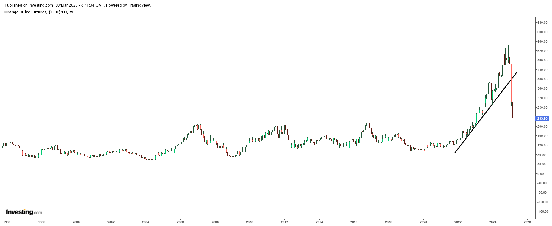 כתבתי בעבר , ממשיך לכתוב גן שמואל נסחרת בחסר . לצערי (שינויי אקלים) זה יימשך ויימשך , מצורף גרף מבלומברג של מחירי מיץ תפוזים. מחזיק בנייר.