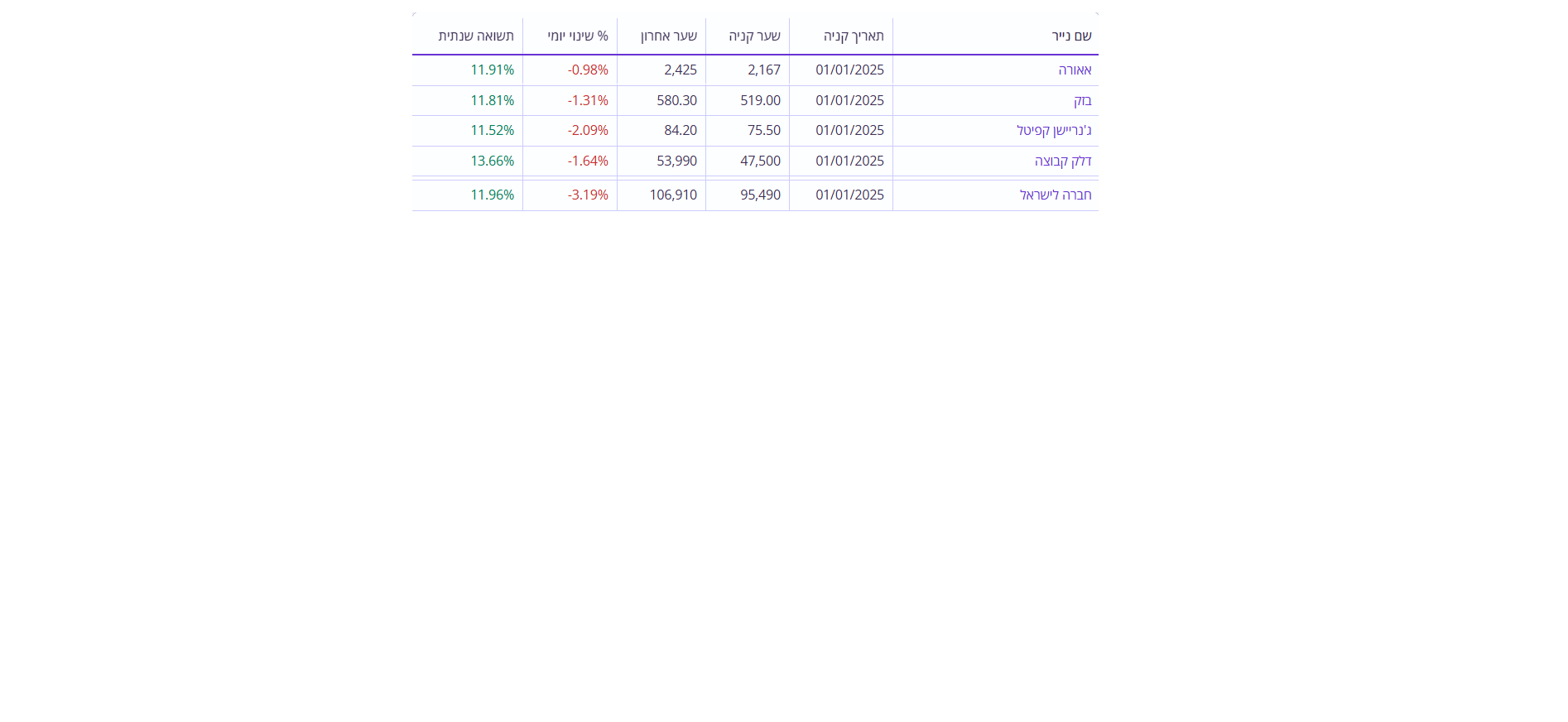 אאורה ,חברה לישראל ,פועלים, גילת,ערד אלו כביכול חלק מהנותנות בראש בשקט בלי טרררם אבל רונן כמו בכל מניה צריך כניסה נכונה בגזרה הנמוכה ויש להתעקש על כך ככה זה מבטיח תשואה רציפה ואופציה לממש תמיד . בהצלחה.