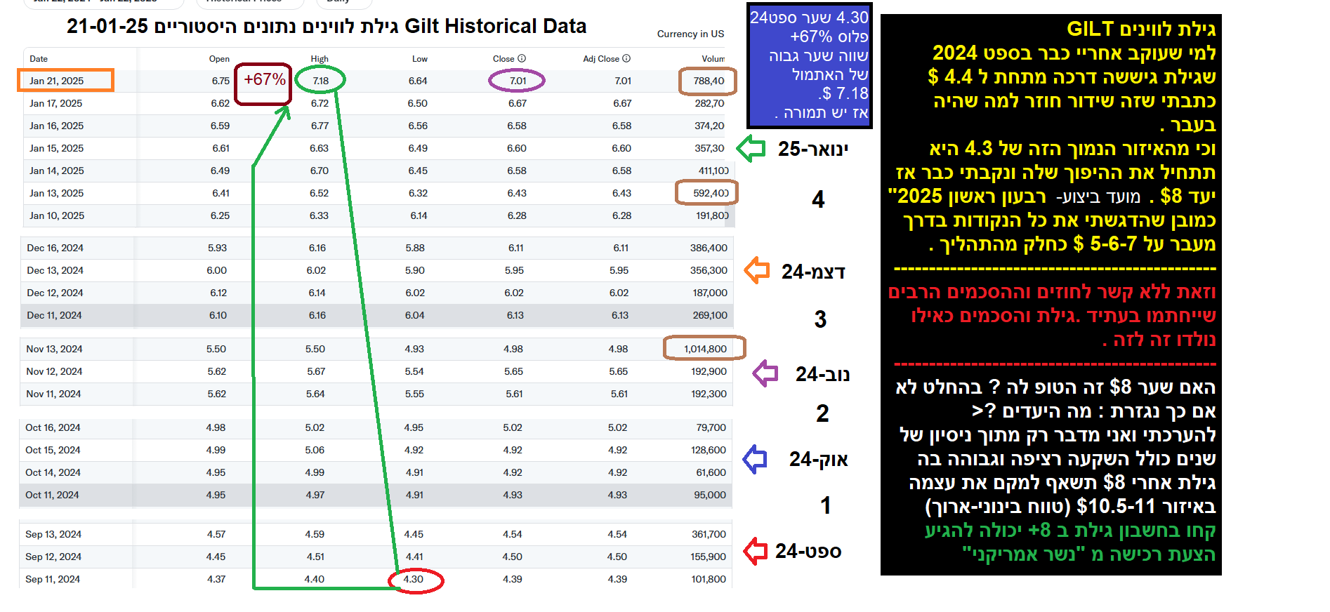 אתרכז רק בגילת לוויינים GILT בעולם המהמרים קיים מושג שנקרא "כסף על הרצפה" והמשך אומר: רק צריך לבוא ולאסוף אז באלה המילים פחות או יותר השתמשתי בהקשר של גילת . מי שמכיר אותי טוב יודע שאצלי גילת נחשבת למניה מובילה מס 2 בתיק ז"א ההשקעה בה ברמות אחרות לעומת שאר התיק 20 מניות אחרות יכולות לרדת ואם גילת תעלה אחוזים בודדים התיק יסיים בירוק . אותו הדבר משחק גם לכיוון השני . ומדוע אני מדבר על מניות מובילות ? כי כל משקיע למרות פיזור נרחב של השקעותיו עדיין תמצא אצלו מניות מובילות שהן אלה שלמעשה יקבעו את שורת הרווח או ההפסד האמיתי . נחזור לגילת . מאז אוג-ספטמבר 2024 זמן שבו חזרתי לכתוב בפורום כתבתי עליה לא פעם ועל זה שהיא נמצאת בקידומת 4 שמבחינתי זאת הגזרה הנמוכה שלה המיועדת לקניות ולאחסון לטווחים קצר בינוי וארוך .וכבר אז נקבתי יעדים שאולי נראו לאחרים כמו יעדי חלום .אך עבורי הם בגדר מציאות וישימים . 5-6-7-8 $ .היום בדיעבד אפשר לומר : ששלושה מהיעדים האלה כבר נכבשו . נשאר היעד הבא 8$ שהוא החשוב מכולם ומדוע ? כי גילת לאורך השנים תמיד מיעד זה או שקיבלה הצעת רכישה גבוהה הרבה יותר מהיעד או שהמשיכה לעבר יעדים הרבה יותר גבוהים. אז גם כאן המבט שלי עליה הוא קדימה צפונה . אני מדבר על טווח ישום בינוני במסגרת רבעון ראשון של 2025 או תחילת רבעון שני. יש כאלה שיגידו :הוא מדבר מפוזיציה כי הוא מושקע שם הרבה . זה נכון ומדוייק ואין לי כוונה להסתיר זאת . אלא מה ? בכל הניתוחים שלי אני מנסה לתת רק נתונים ועובדות ומתעלם מהעובדה שאני מושקע שם .ככה ניתן לשפוט אך ורק על פי העובדות והנתונים בפועל. לסיכום : מי שלא טרח לרכוש את גילת שהיתה בקידומת 4 או 5 או 6 לא עשה את ה 67%+ שהיא נתנה לא נורא עדיין יש לו מקום בקידומת 7 להשכלתכם מ 7 להגיע ל 8 מדובר ב 15%+ אין זו המלצה לקניה או מכירה הכל נכתב כדי לחשוף אתכם לדרך חשיבה נוספת. מצ"ב