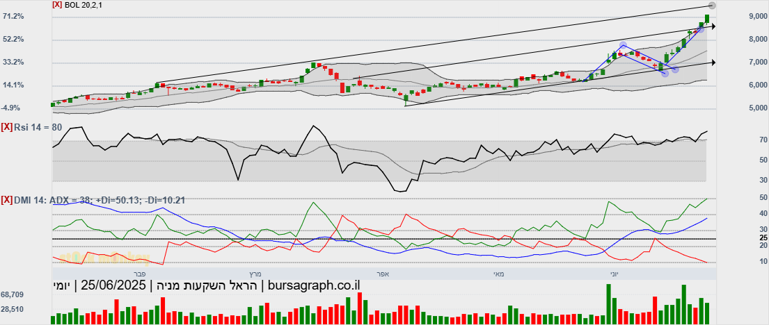 מספר רב של ימים בהם המניה מטפסת אל גבהים חדשים,ובהתאמה להתנהלות של הפיננסים,ופריצה של תעלות ודגלים,יש מצב שהמתנד המהיר עשוי לדקדק את ה 85,כשהיעד הבא-9500,ולכן זה הזמן לע"ד לממש שני-שליש מהאחזקה,לקחת רווחים לכיס,ולהנות מהפירות של החודשים האחרונים,בהם הפיננסים מככבים בגדול. הערכתי לקראת הפקיעה לסיום החודש,ולפני חודש יולי הבא עלינו לטובה,כך אני מקווה להמשכיות!
