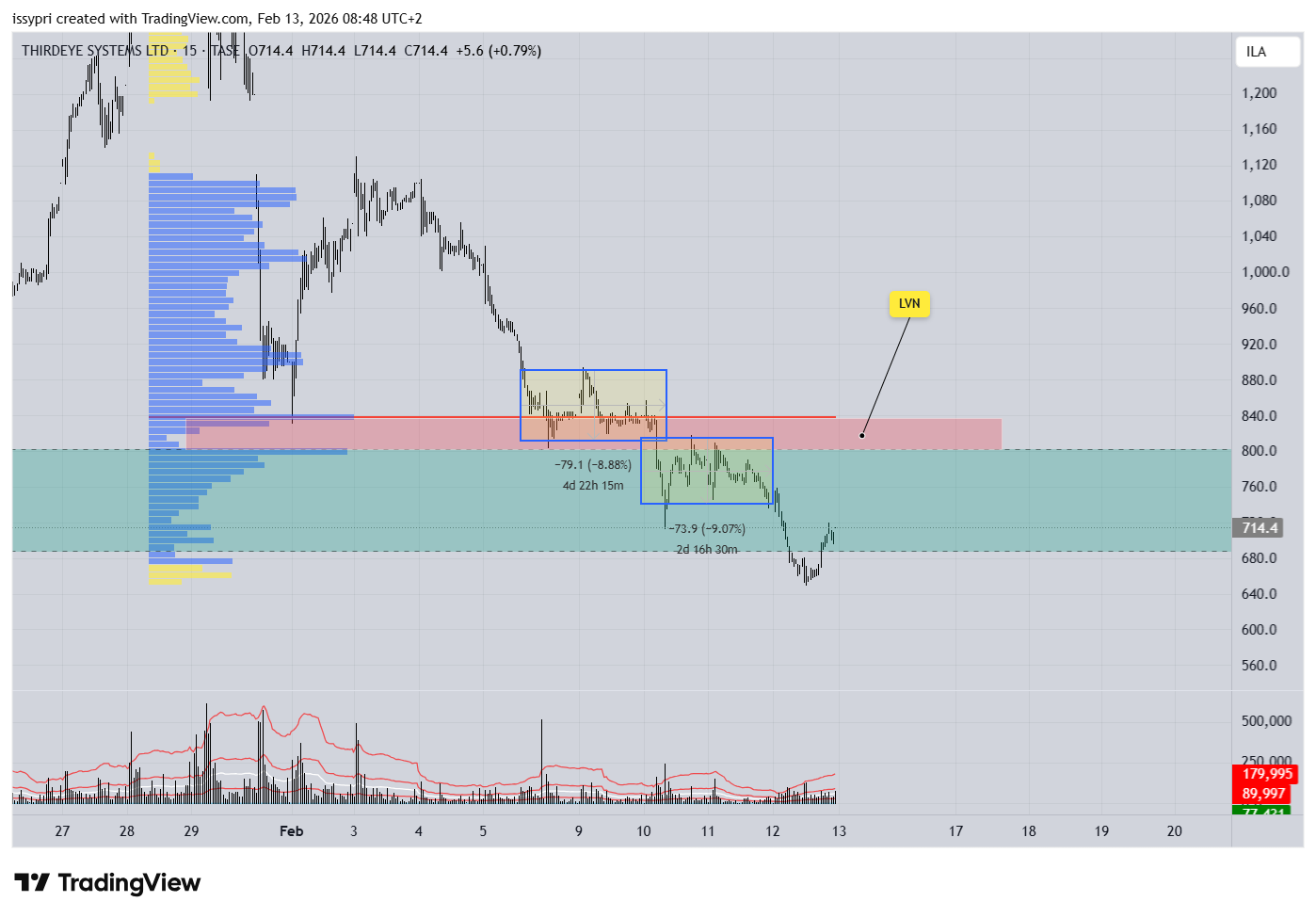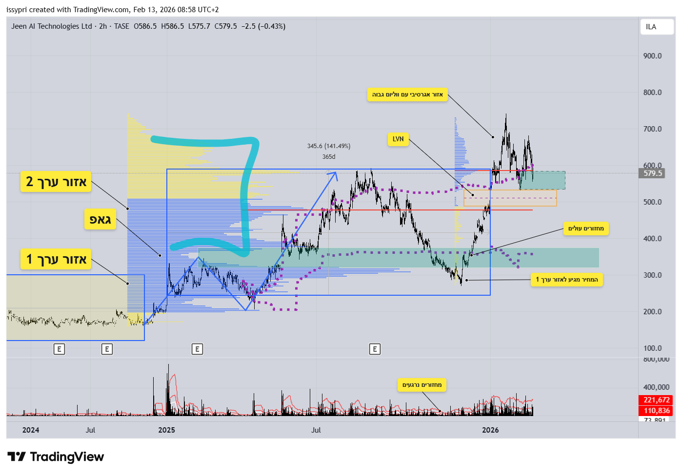 מסתכלים ב 2 רמות - הקרובה - 487-535 - אזור ווליום נמוך. המחיר מייצר אזור ערך. השאלה היא האם הוא יקבל אותו וימשיך הלאה. תצורה לא רגועה עם ווליום גבוה מעידה על אגרסיביות משני הצדדים. לא אידאלי לתנועת המשך. ברמה הגבוה יותר - 320-375 הוא אזור הדיסקאונט של אזור הערך הגדול. הרמה הגבוה יותר היא תמיד החשובה יותר. לכן, אם הייתי צריך לבחור אם להיכנס ברצועה הקרובה של הרמה הנמוכה או של הרמה הגבוה, הייתי מחכה לגבוהה. כלומר מחכה ל 370. זו לא תחזית של מה יקרה אלא בחירת סיכונים. אני מעדיף לראות את המחזורים נרגעים ולבחור באזור הדיסקאונט של הרמה הגבוה יותר. ראה דוגמה משמאל מ2025.