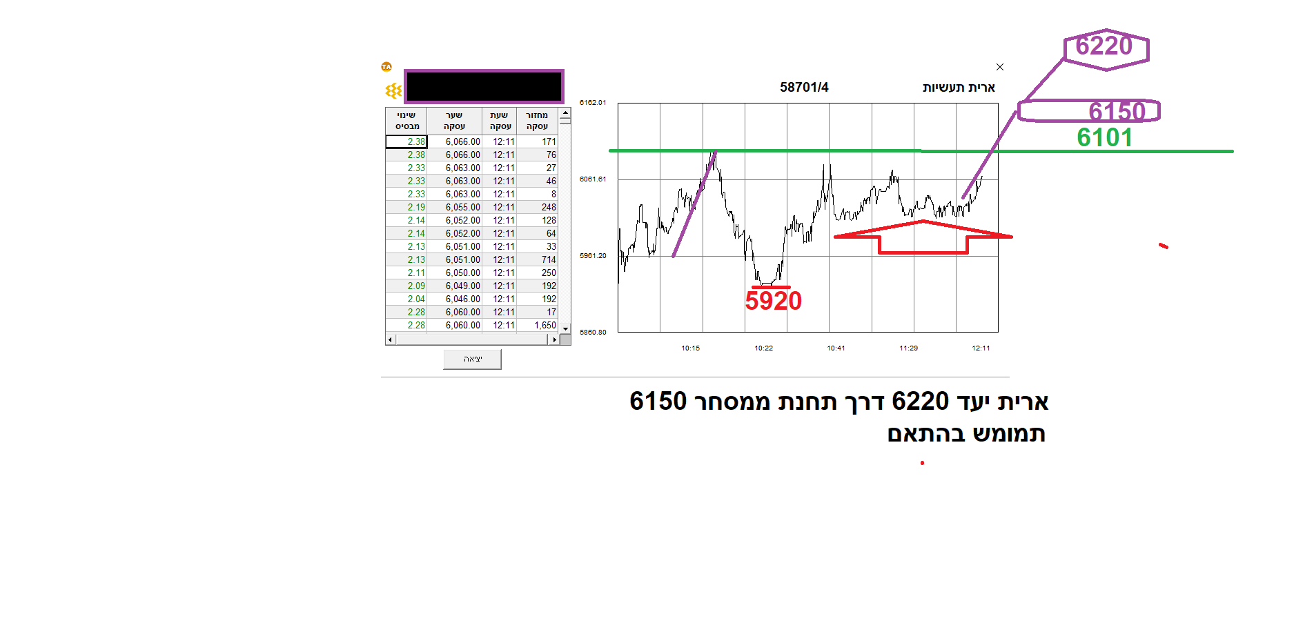מעל 6200 עשויה להצפין ליעד של 6500,ואולי לקראת סוף השבוע הזה,חמישה ימים של מסחר,ופריצה מעל עשויה גם לדחוף אל יעד השיא השנתי,ובתנאי אחד חשוב שיכנס הטריגר של גידול חד במחזורים!העליות אינן מאומתות ללא הגידו במחזורים! דרך אגב,התנועה בארית מאד דומה לתנועה בעשות כשהנרות נעים על תחתית התעלה העולה,עד לקפיצה צפונה כשנכנסים חיזוקים יפים מהקרנות העוקבות.