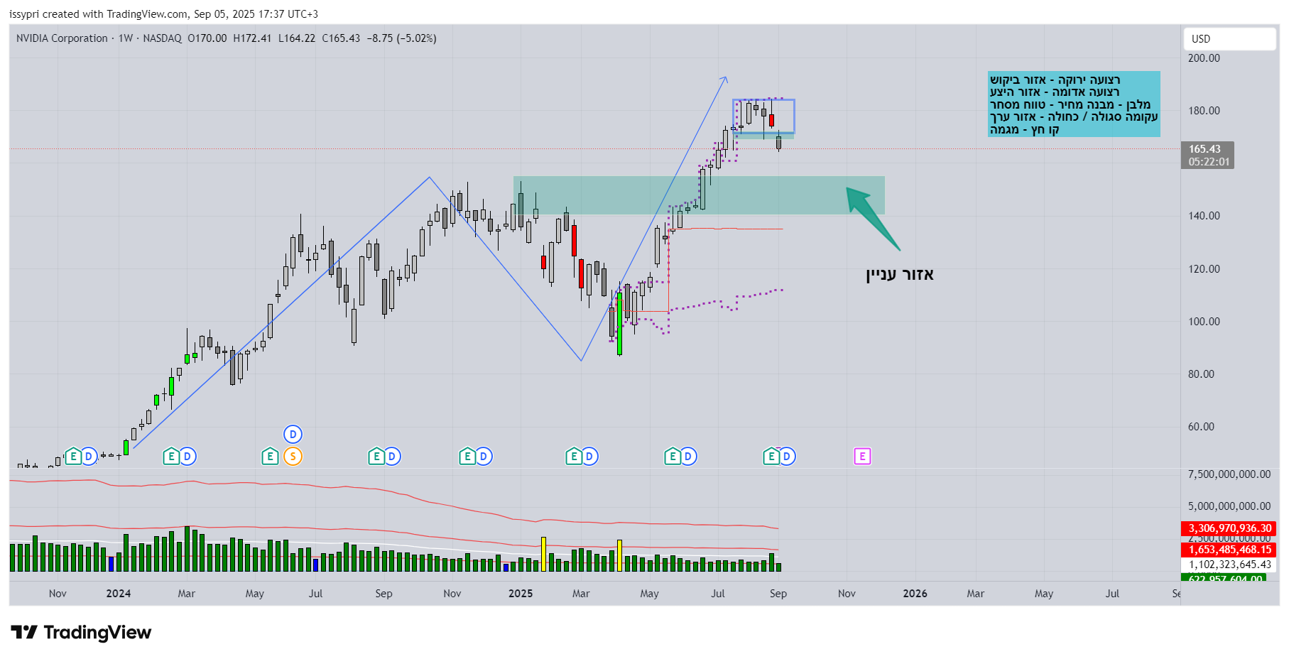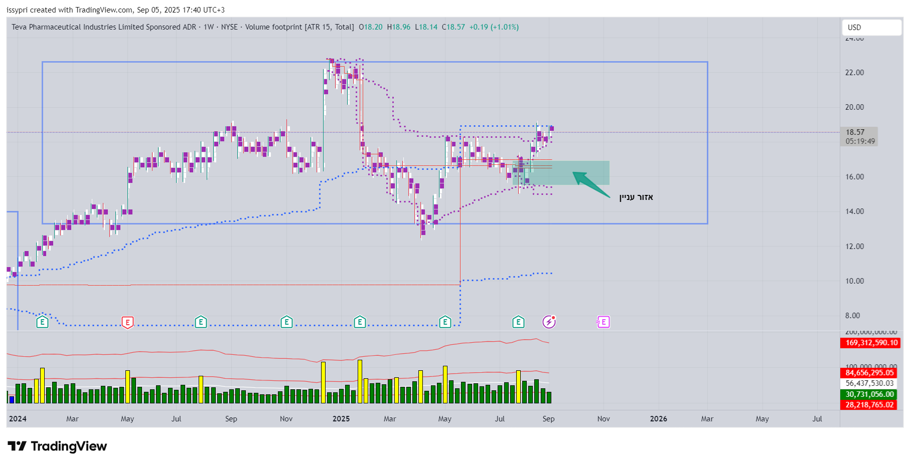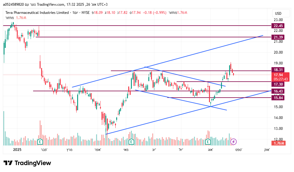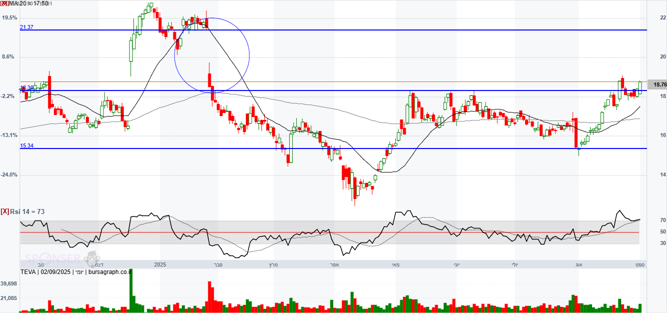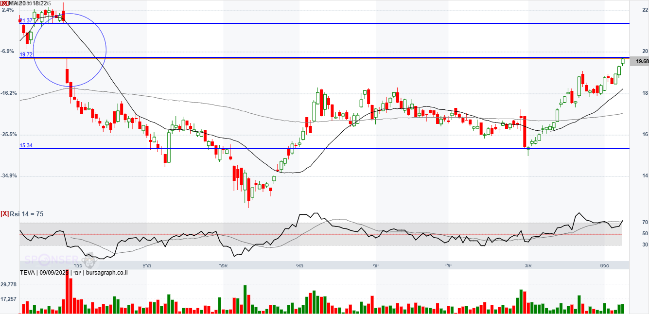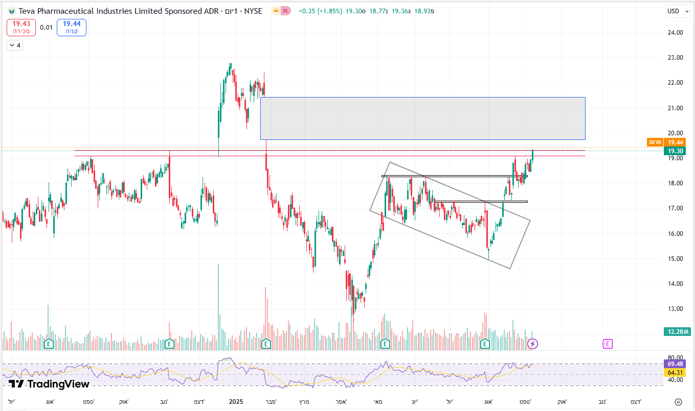 טבע לאחר מספר שנים קשות שהשיא שלילי הגיע לאזור 6$ החלו מסע עליות שהסתיימו ב-12/24 לשער 22.7$. משיא זה של 22.7$ ירדה במשך 4 חודשים 04/25 לשער 12.7$ זה ירידה של 44% ירידות אלו החלו מאחר שאנליסטים שמסקרים את טבע פיקפקו בהמשך הצמיחה שטבע הציגו בשקפים,והאנליסטים אמרו שחובת ההוכחה היא על טבע מאחר שיש לה חובות אדירים וכדי להראות שתצא מזה צריכה להוכיח בדוחות הרבעונים הבאים שהיא תעמוד ביעדים. מי שעוקב אחר טבע רואה שהחל מאפריל משער 12.7$ החלה במסע התאוששות שהגיע לשער בסביבות 18$ וזה עקב דוחות שהוכיחו שהם עומדים בצפיות ומצד שני הם גם לא בשמים. לאחר 4 ניסיות פריצה של 18$ שלא צלחו המניה הגיבה בירידות עד 08/25 לשער 15.3$. מחודש שעבר לאחר דשדוש מסויים יש איזה שהוא ניסיונות פריצה מחדש המניה עולה יפה כבר מעל שבוע והגיע שוב לאזור 19.5$ ששם אזור קשה. מניסיון עבר טבע נכשלה 3 פעמים כאשר הגיעו לשער 19.9$. נראה לי שהחל מהיום יש כבר ניסיונות לאתגר את האזור הקשה הזה 19.9$. כרגע במסחר המניה על 19.75$ לא יודע מה יסתיים היום אבל במידה ותפרוץ אזור זה לא רואה בעיה שלא תגיע שוב פעם לשיא של לפני 10 חודשים 22.7$ וזה לפחות עד דוחות לרבעון הקרוב