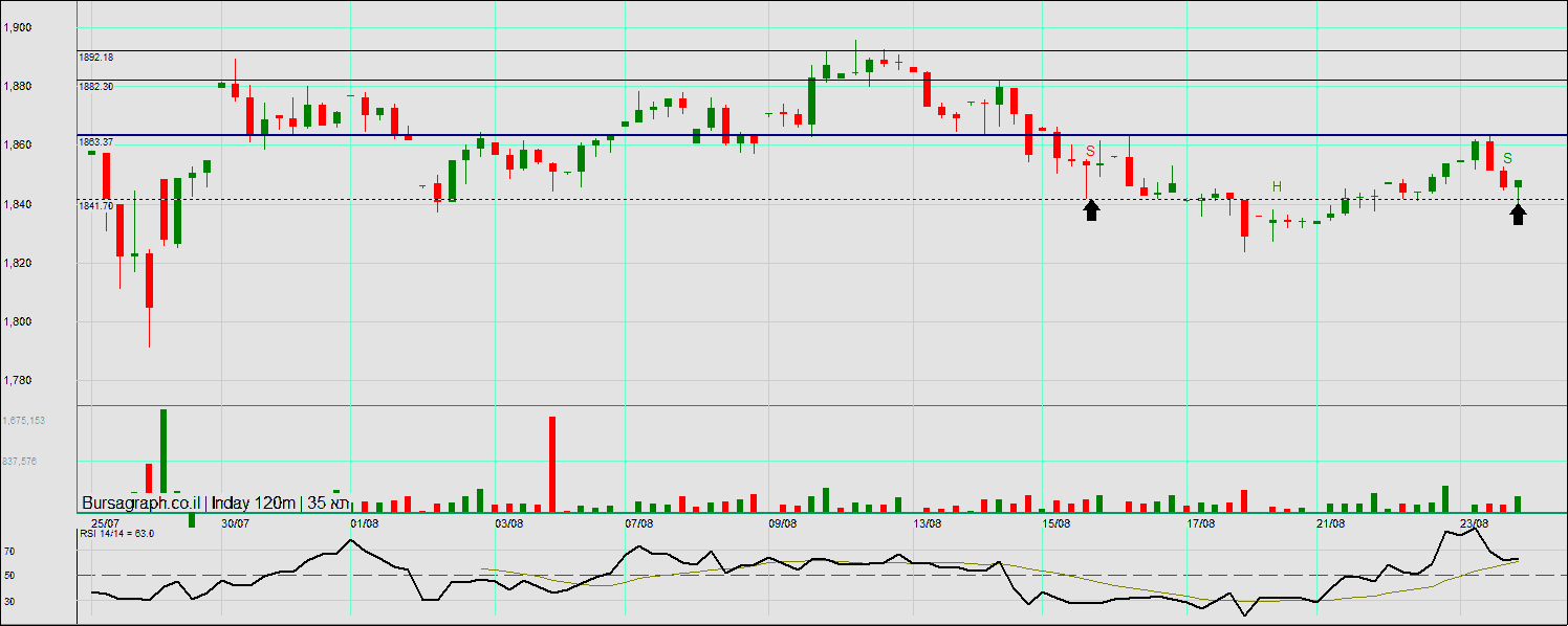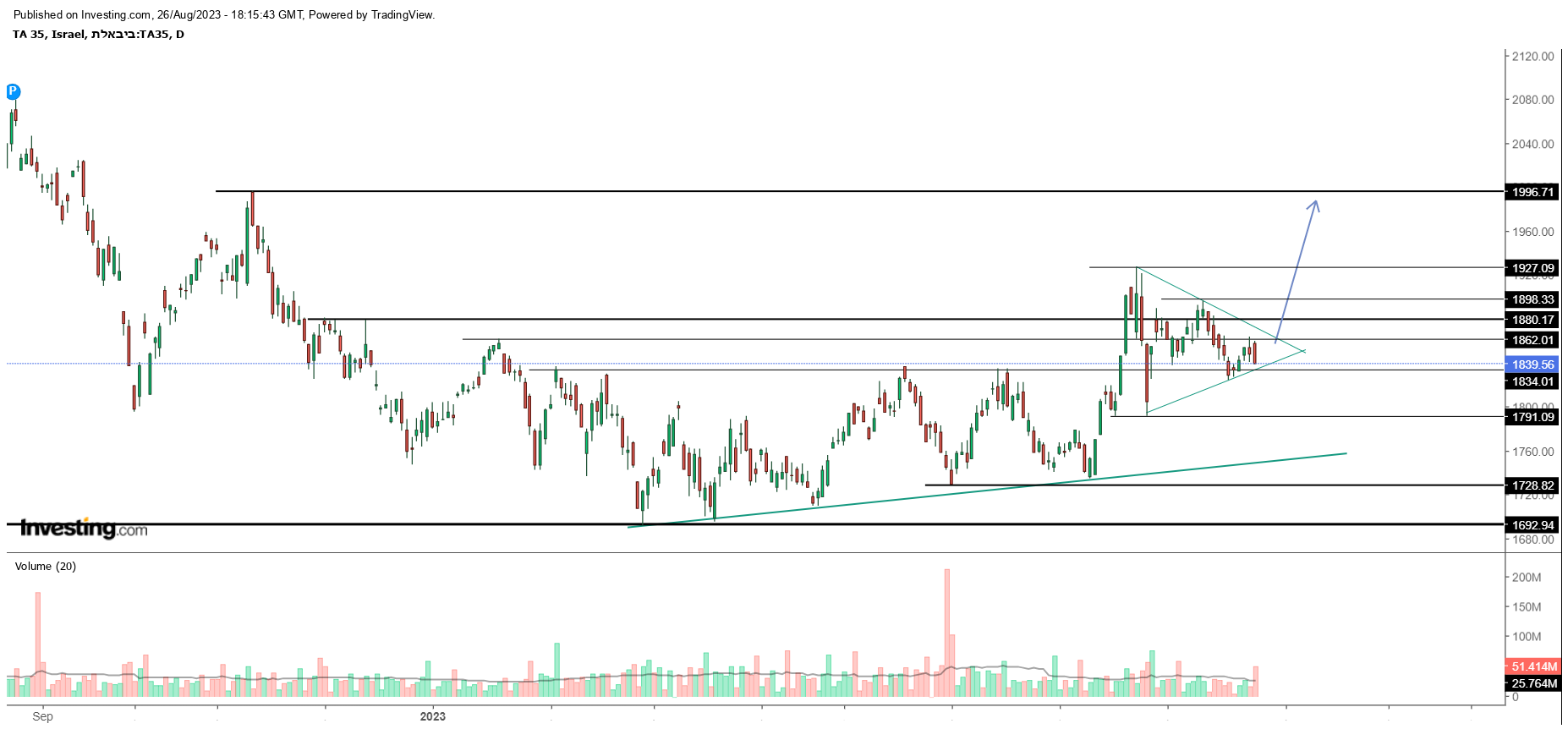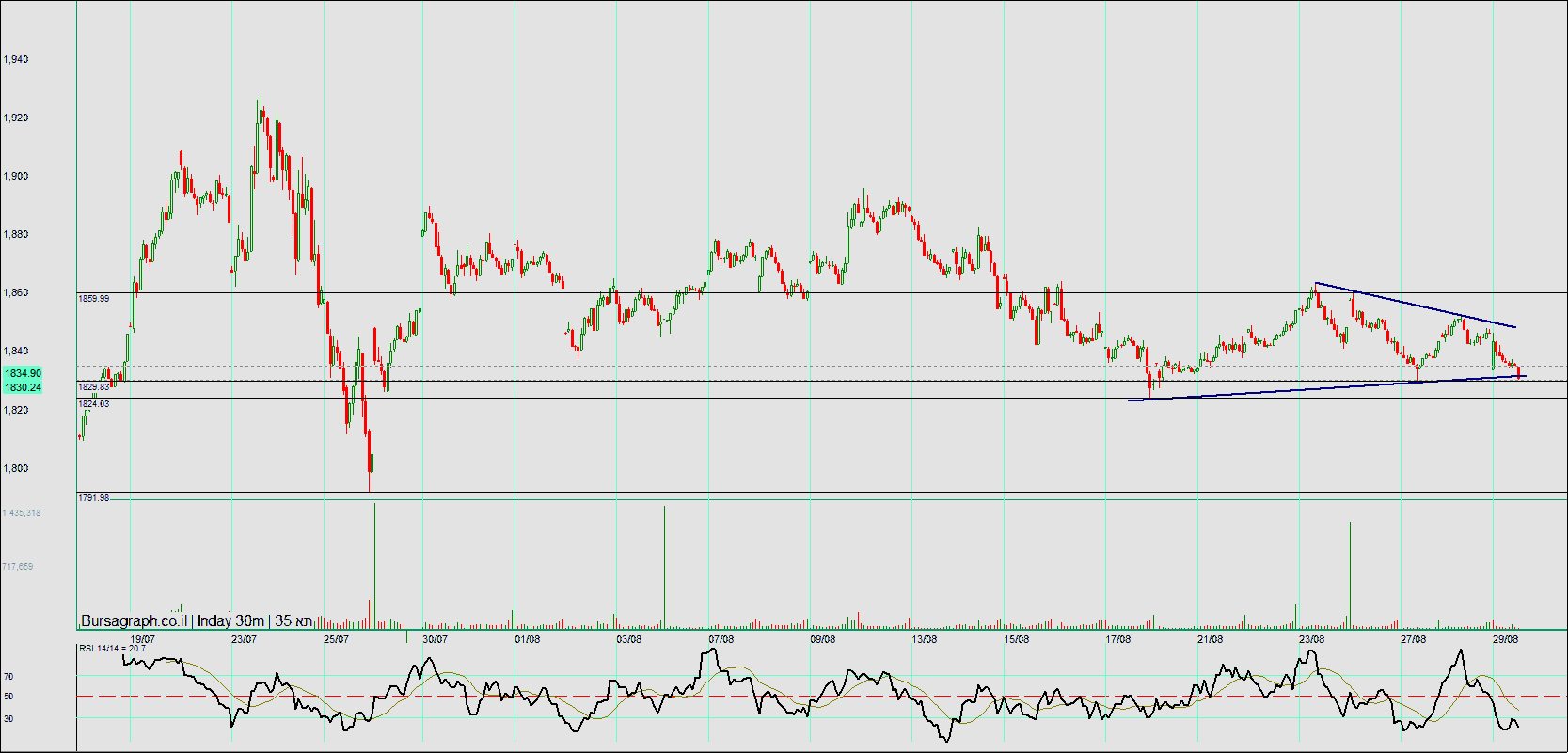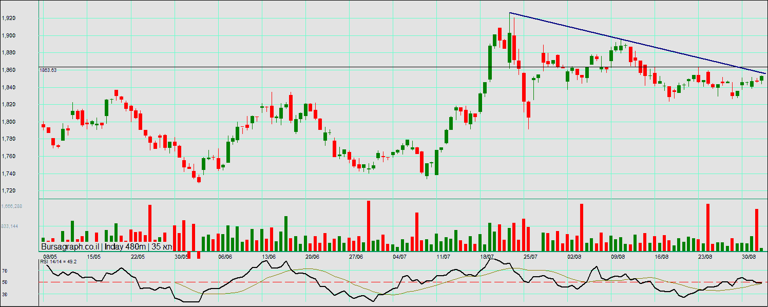 מצורף גרף יומי. בגדול כל עוד שומרים על אזור 1830 הכיוון הוא למעלה ל1996 בגלל פריצת תבנית הדשדוש וגם בגלל האפשרות לדגל ביומי. שבירת 1830 וירדו לאזור 1730-1760. פריצת 1880 ובהמשך התבוססות מעל 1900 נביא אותנו ל1996. ההחלטה על כיוון לדעתי תקרה בקרוב