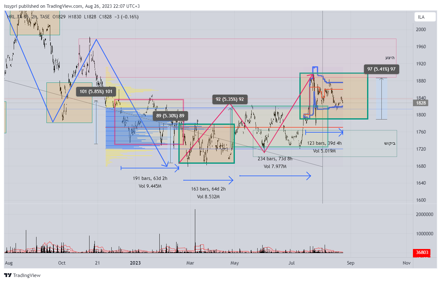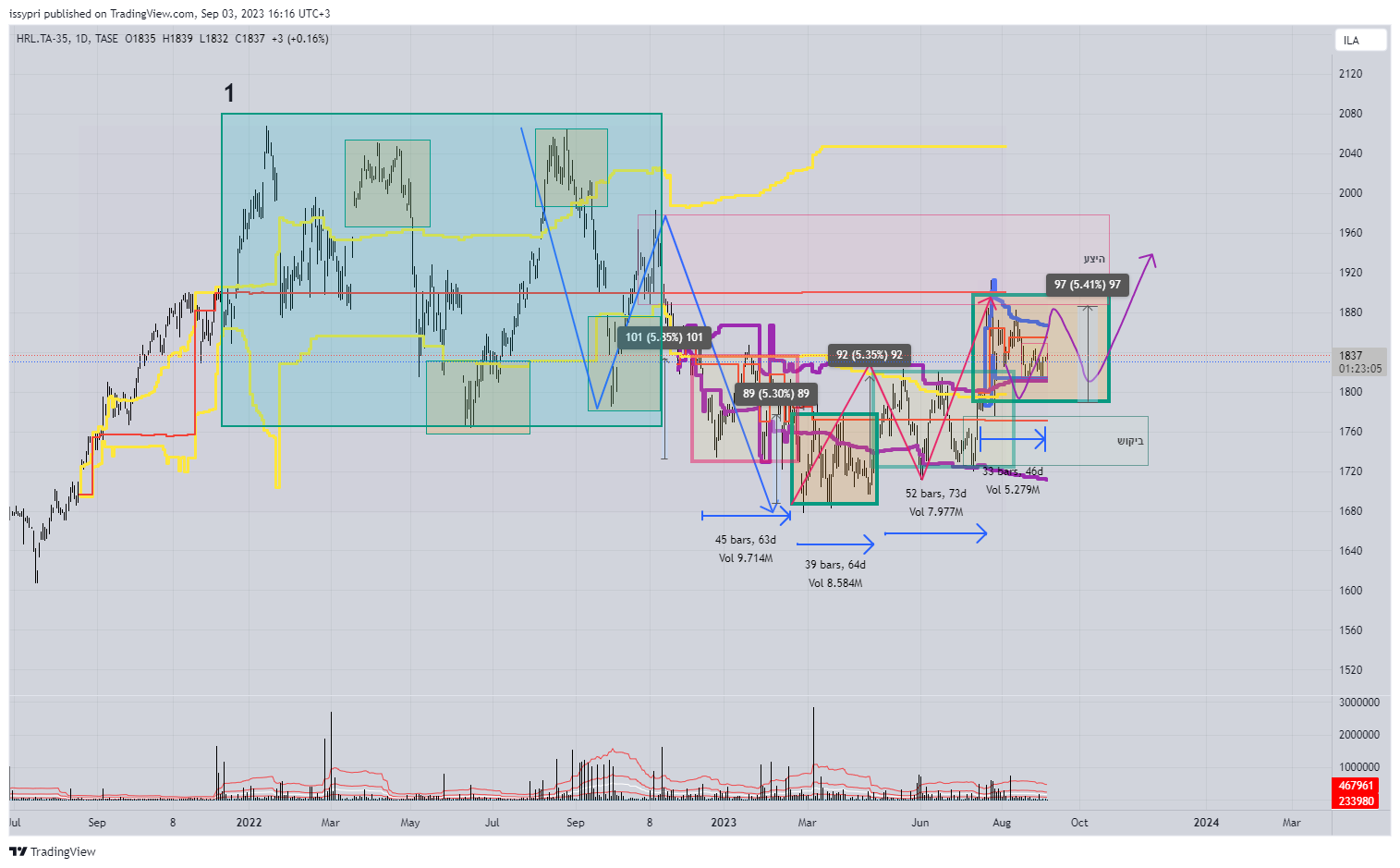 שני דברים מראש. 1. זה הסל הערכים כ 10 נקודות מתחת למדד 2. סליחה על הגרף העמוס, המידע שם חשוב להבנה הסבר : לאחר תקופה של הפצה (מלבן מספר 1 ) המחיר שבר למטה וכעת הוא מתקן חזרה לטווח ההפצה. המגמה הראשית - כחול יורדת המשנית - אדום - מתקנת למעלה בראשית. רצועת ההיצע שיוצאת מנקודת המבנה הראשי (גבוה יורד), בולמת כרגע את המחיר (היצע / התנגדות). המחיר במגמה האדומה נע באופן סדור בטווחי מסחר. הטווחים מתוחמים בגרף במלבנים. כל טווח אורכו כ 63 עד 73 יום. גובהו כ 90 עד 100 נקודות. הצפי לכן הוא תנועה בטווח החדש שנוצר (עקרוני, יתכנו יציאות לשוליים), כמתוארר בקו החץ הסגול. כל שאר הניתוחים, לדעתי, בטווח (קוי מגמה, תבניות פנימיות וכו), פחות רלוונטי אלא אם כן אתם סוחרי מעוף וכאן נדרשת רמה אחרת של ניתוח. מה שחשוב כעת הוא להבין שאנחנו מחתת לרצועת היצע של מגמה ראשית יותר. גם חשוב להסתכל על התמיכה (רצועת הביקוש) ששומרת כרגע על המחיר מלמטה.