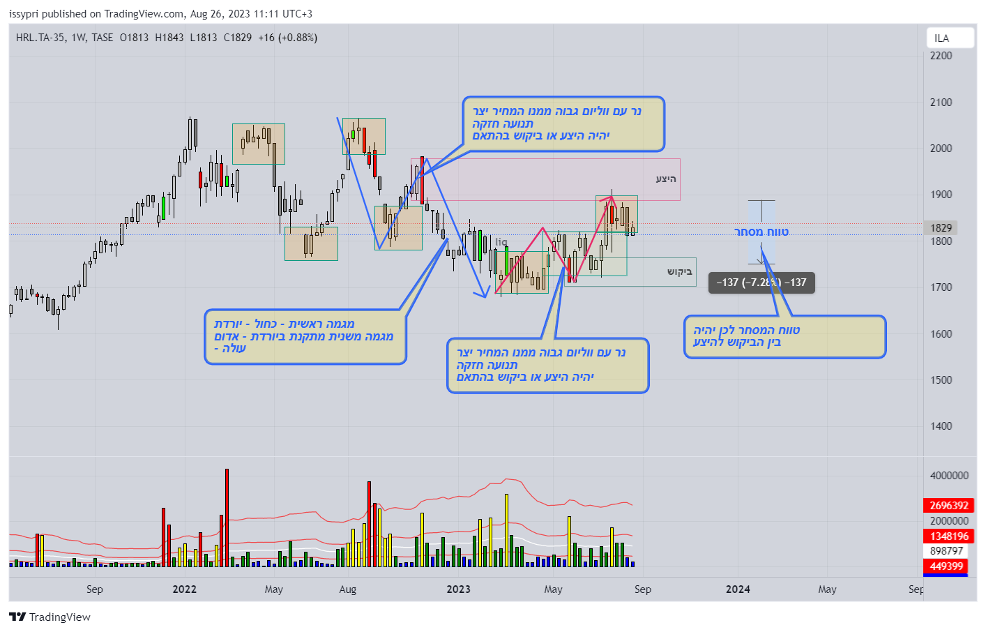 ולקראת מחר ובכלל. המעוף נא ב 2023 בסביבה די צפופה של תנועות צד. כל תנועה כזאת אורכה כחודשיים - חודשיים וחצי והגובה של נע בטווח של 90-100 נקודות. התנועה הזאת היא למעשה טווח מסחר בו יש הסכמה בין קונים למוכרים על הערך ההוגן, זול ויקר. כלומר - השוק ניהל תצורה די מסודרת וצפופה של מסחר. כדי לקיים טווח כזה צריך לייצר ערך. ערך נמדד בווליום. ווליום נוצר ע"י אינטרקציית מסחר בין קונים למוכרים. המגמה למעשה היא תנועה בן האזורים האלו. שהמחיר מייצר ראלי ובורח מאזור כדי לייצר אזור חדש - נוצרת מגמה. מאחר והתנועה הנוכחית נמצאת בחלק העליון של טווח המגמה הראשית - מסומנת כחול - יורדת, זה נחשב לאזור פרמיום - כלומר אזור יקר במונחים כלליים. לכן הצפי הוא תנועה בטווח עם אפשרות ביקור בPOC - הקו האדום בפרופיל, שם היה מרכז הכובד של ההסכמה האחרונה.