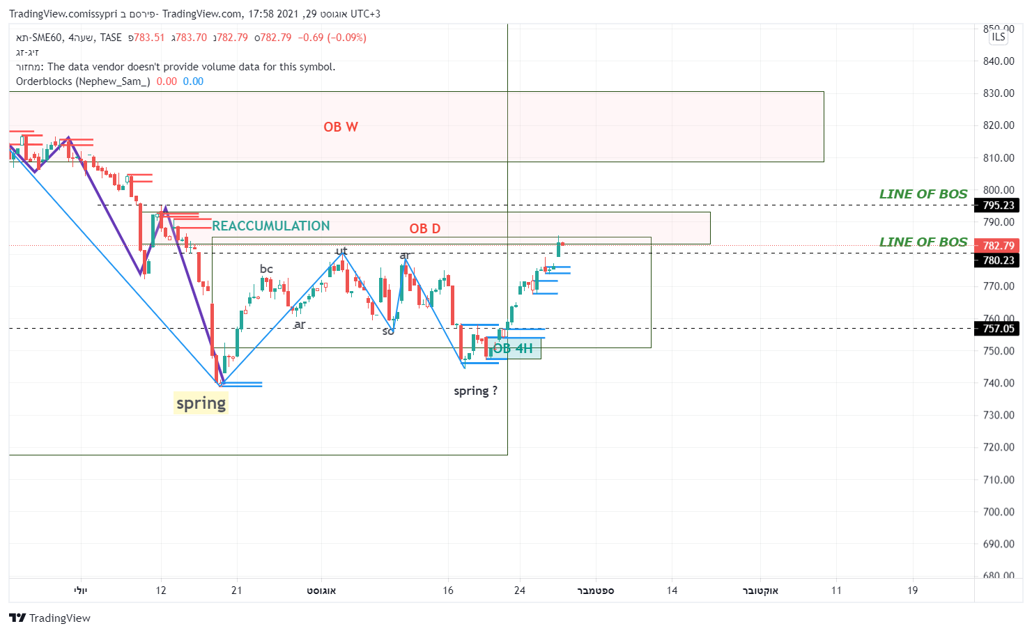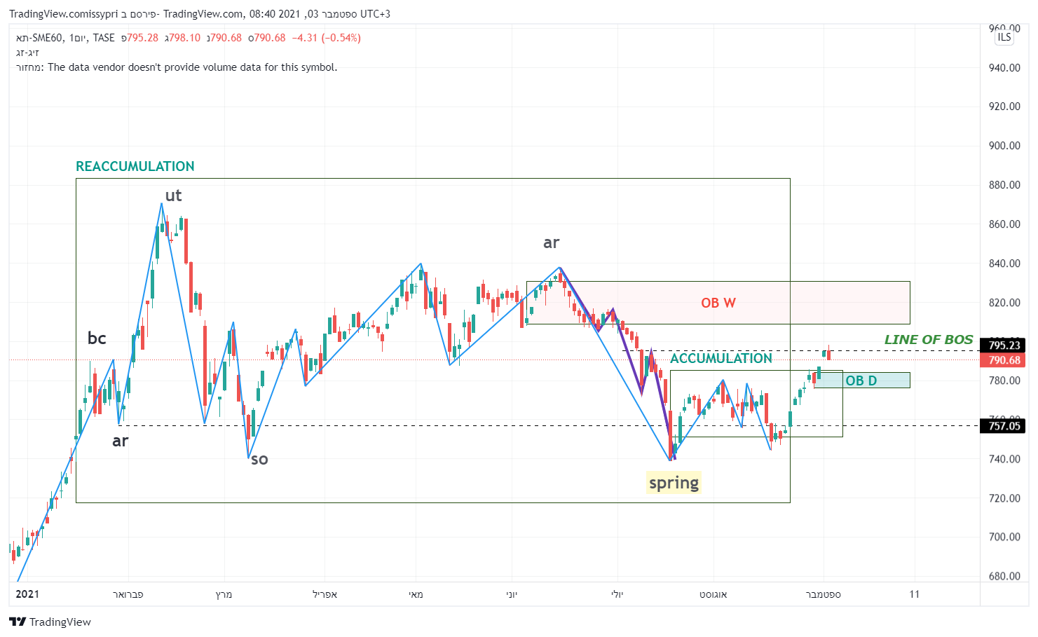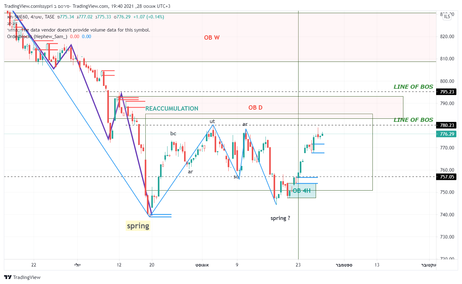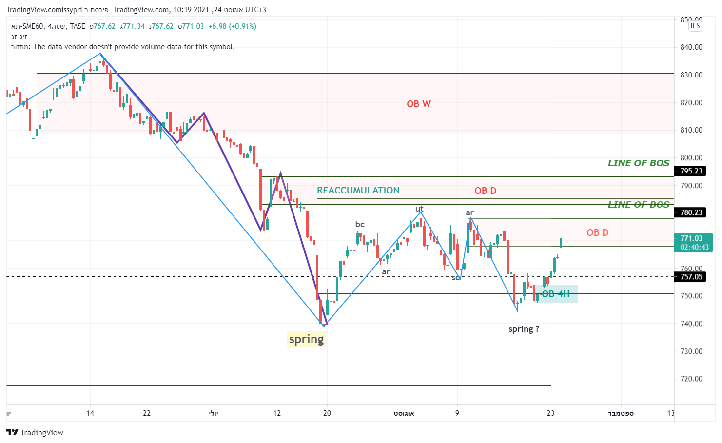 מבט קצת יותר רחב. תבנית צד (איסוף לדעתי) מחודש פבר. התחתית שנוצרה ב 19-20 ליולי מסמנת כנראה את הנמוך האחרון בתבנית. מאז המחיר יצר תבנית איסוף רו בשפה הטכנית - תחתית כפולה. קו הצוואר (המבנה) של התבנית נפרץ וכעת המחיר חונה מחתחת לקו מבנה יורד (הגבוה האחרון במבנה הסגול). פריצה שלו והמחיר הולך לרצועת ההיצע - 809-830. המומנטום הזה יכול להביא את המדד להתמודד עם השיא האחרון - 870.