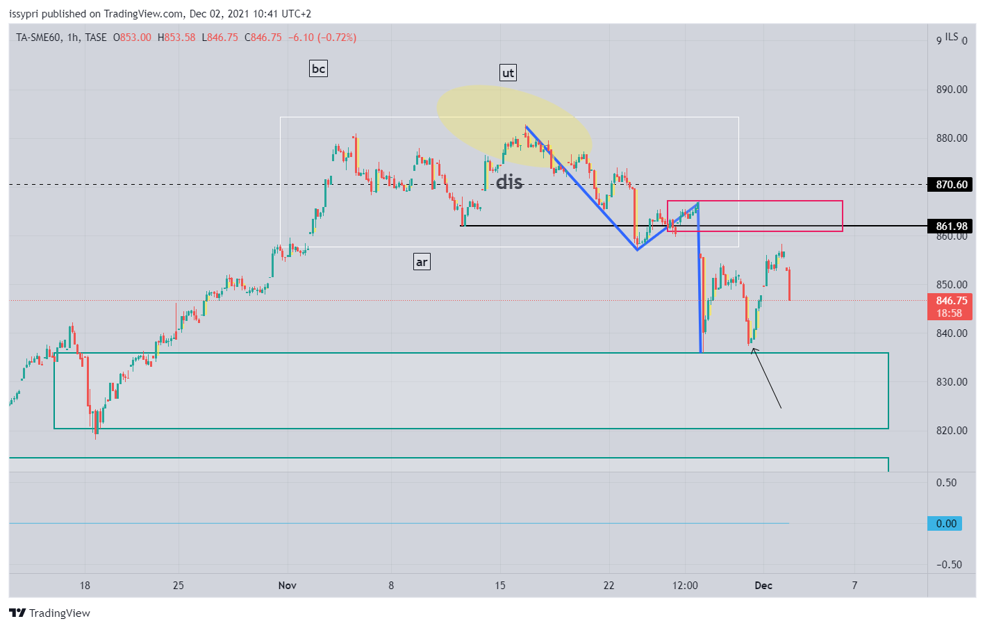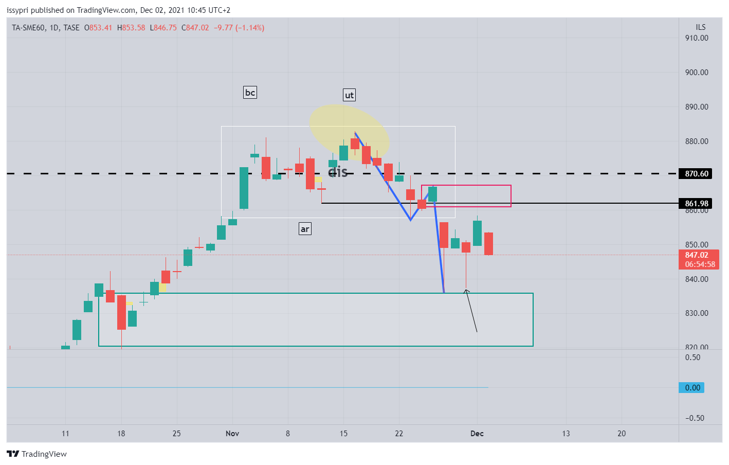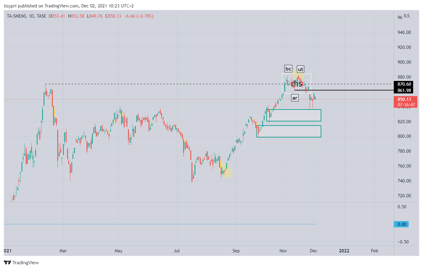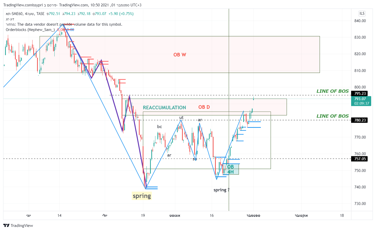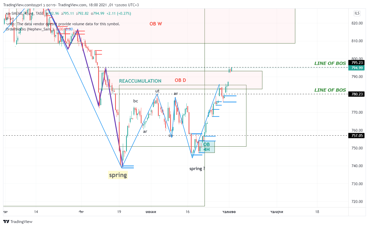 מבט קצת יותר רחב. תבנית צד (איסוף לדעתי) מחודש פבר. התחתית שנוצרה ב 19-20 ליולי מסמנת כנראה את הנמוך האחרון בתבנית. מאז המחיר יצר תבנית איסוף רו בשפה הטכנית - תחתית כפולה. קו הצוואר (המבנה) של התבנית נפרץ וכעת המחיר חונה מחתחת לקו מבנה יורד (הגבוה האחרון במבנה הסגול). פריצה שלו והמחיר הולך לרצועת ההיצע - 809-830. המומנטום הזה יכול להביא את המדד להתמודד עם השיא האחרון - 870.