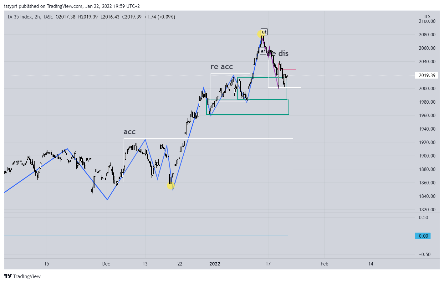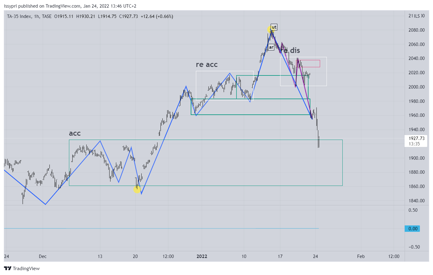 הלג העולה האחרון מסומן בשתי נקודות צהובות. התיקון החד שחווינו הביא אותנו לבסיס התנועה העולה. מה שחשוב להבחין בתנועה הזאת הוא הגאפ (מלבן סגול) שדילג על רוב אזור האיסוף מחדש (re acc). יש שם הרבה קונים "לכודים" והמחיר, תלוי ברוח גבית שיקבל מארה"ב, ירצה להגיע לשם. כל עוד אנחנו מעל התמיכה המסומנת, אנחנו במבנה עולה ברמה הגבוה.