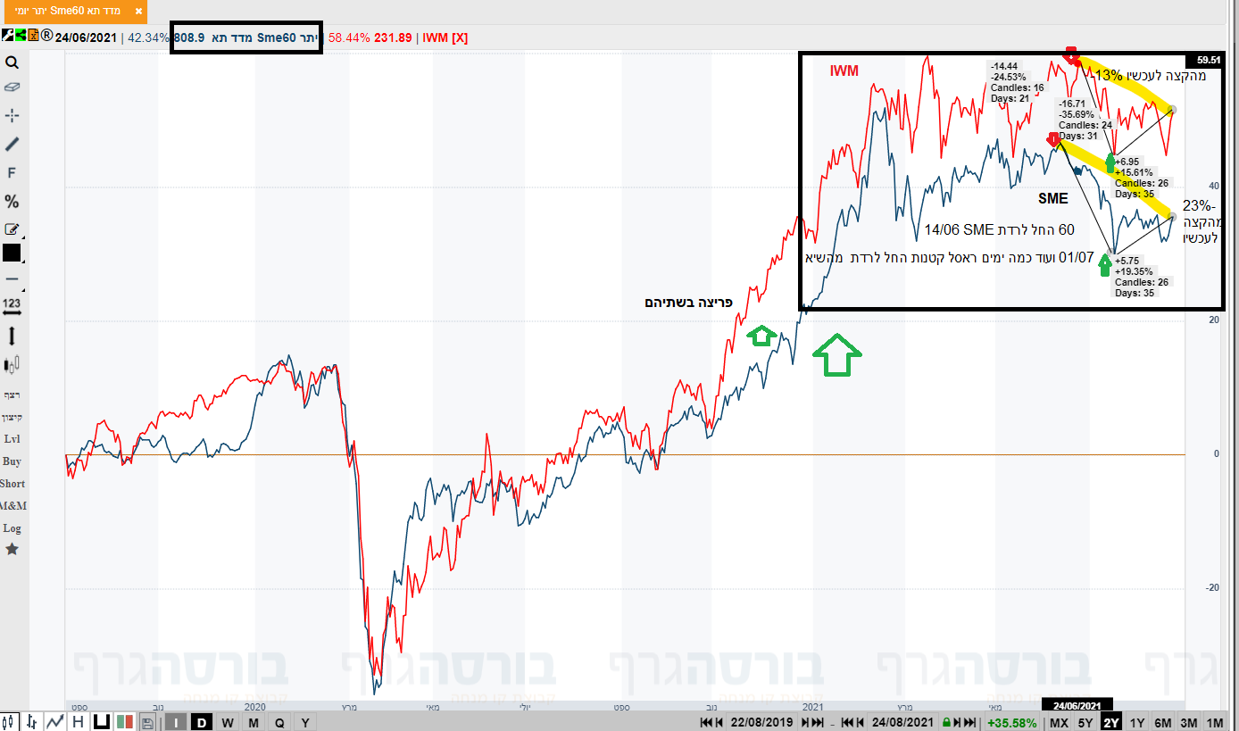 ובין פה ואין לדעתי מה להשוות. לא במחזורים ולא בידיים. הנה גרף השוואה (להבדיל אלף הבדלות בין השווקים) וכל אחד שייקח את זה לאן שהוא רוצה. שניהם היו בישאים, פה ירדו יותר ב 10-11% יותר בערכי השוואה. ונכון לעכשיו גם פה נמצאים פחות ב 10%. פה תיקנו יותר מה 15.07 למרות שרושמים רק יומיים או כמה ימים או ימים אחרונים כי מסתכלים כנראה על מניות או מגזרים ספיציפיים כי השוק סלקטיבי זה אני לא אומר. SME 60 החל לרדת מה 14/06 שמה מתחילת יולי שתיהם אחרי תנועה חזקה מעלה משנה שעברה. יש 60 מניות ב SME שמה 2000, אין מה להשוות ( וגם במרץ ירדו בשתיהן ותיקנו) ------------------------------------ בירידות ( כי שהכל עולה כולם שמחים) שמה אם תרצה לצאת מהקטנות אין בעיה, תפעיל סטופ. פה איןמי שיקלוט. שמה תיקון עולה לחילוץ יכול להיות משמעותי , פה בקטנה ויכול להימשך גם הרבה זמן שאין ידיים. לא חושב שיש מה להשוות בכלל בין 2 המקומות. זה שרוצים שיעלה פה ומביאים להשוואה, שיביאו. בפועל כבר 3-4 שבועות לא יותא לי טרייד פה על אגורה( גם היום...) שמה שיש פריצה פורצים ( רובטריק בכיף מוציא). כנ"ל גם סטופ. השאלה מה קורה שמומנט יורד, דועכים שוק סלקטיבי ( מה שיש לאחרונה גם שמדדים עולים). אז עלו פה רק ימים אחרונים וירדו חצי שנה? ----------------------------- לכן אומר יש מניות ויש מניות ,עם בנקים ירדת פחות פה והתאווררו קודם ( ועדיין מבאס אותי שלא פרצו קודם) ועם אחרות ירדת למטה חד גם ששם נעו לצד בחלקן ועשו תיקון עולה קל לפני בדיקה נוספת למטה נגיד. בהצלחה