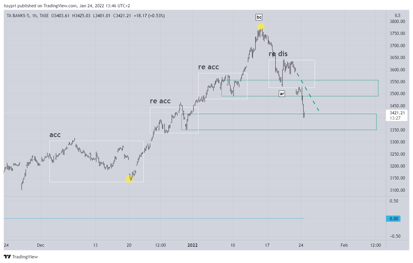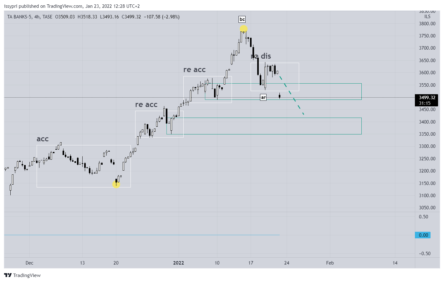 הבנקים הגיעו כצפוי לידע הראשון להבדיל מ 35 ומ 60 יש להם עוד מרווח לרדת עד שהמדד ייחשב דובי (רצועת ההגנה למטה עם הכיתוב (acc) כרגע המחיר מתמודד עם הרצועה 3350-3420.