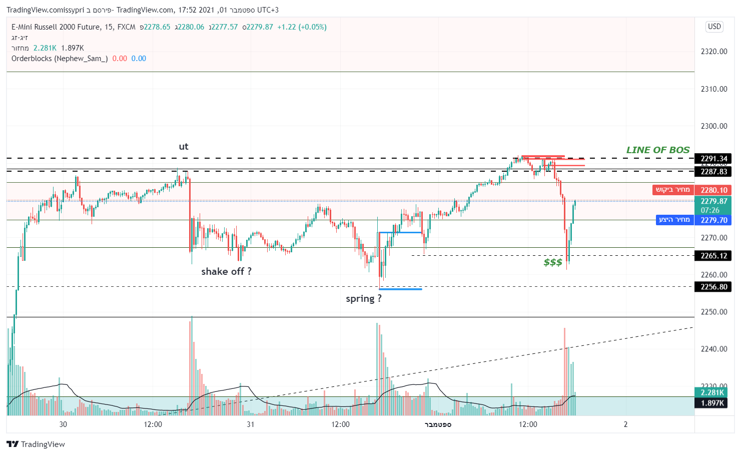 הבוקר ציינתי שהמדד פרץ את גבולות תבנית האיסוף וחנה מתחת לקו ששומר על מבנה יורד 2291 אותו אני מניח שהוא יפרוץ. מעניין לראות את התנועה החוזרת של ירידה מתחת לקוי תמיכה, חטיפת נזילות (הוראות הגנה של לונג) וחזרה חזקה למעלה. זה קרה היום בתחילת המסחר (סימנתי את קו ה"תמיכה"). תנועות דומות בנקודות הSHAKE OFF וה SPRING. זו המהות של תבנית איסוף. כעת המחיר חותר חזרה לקו 2291 וזה המבחן האמיתי שיקבע האם נמשיך תבנית צד שתאסוף עוד נזילות או שנפרוץ את הקו הזה ונוכל להגיד שאנחנו מתחילים מבנה עולה.